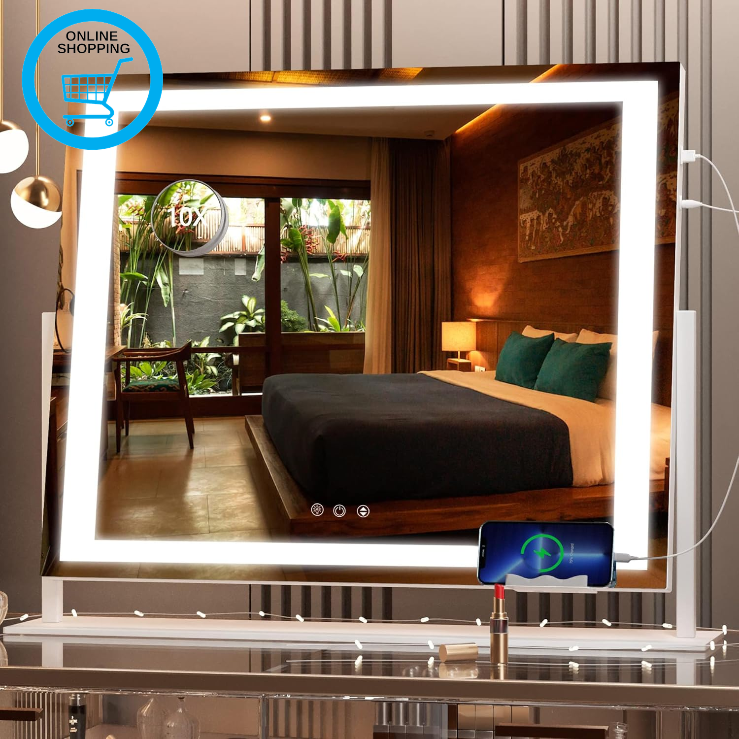 Hasipu Vanity Mirror with Lights, 58 x 48cm LED Makeup Mirror, Light up Mirror with 10X Magnification and Brightness Adjustment, Smart Touch 3 Colors Dimmable, 360° Rotation (Square White)