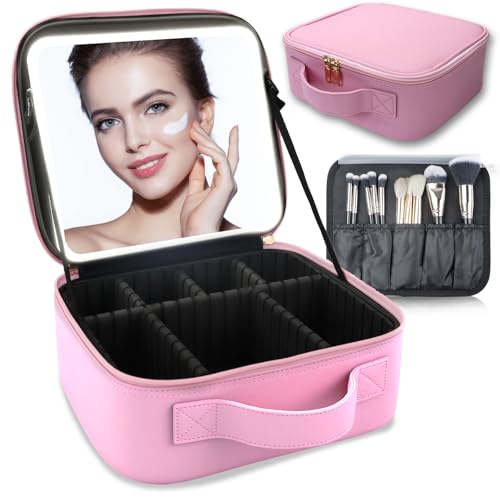SUILU Makeup Bag with Led Mirror,with 3 Color Setting,Portable Storage and Adjustable Dividers Travel Makeup Bag, for Women and Makeup Artists Large Vanity Makeup Cases-Light Pink