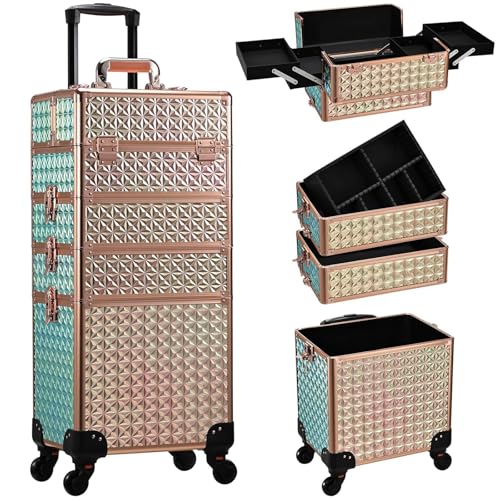 Stagiant 4-in-1 Makeup Trolley Vanity Case Makeup Case Make Up Box Organiser Storage Hairdressing Trolley on Wheels Nail Technician Polish Organiser Box, Shiny Gold
