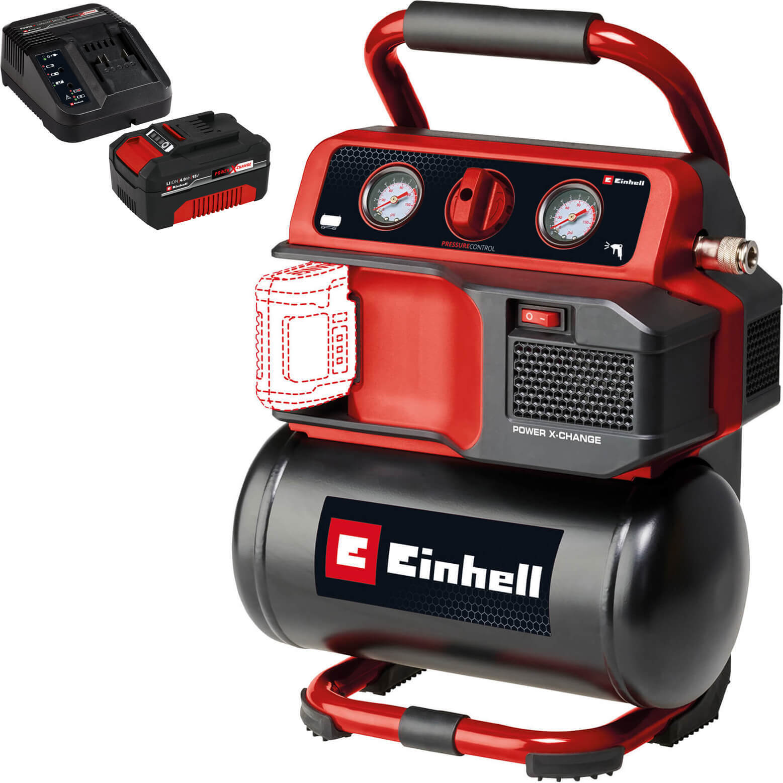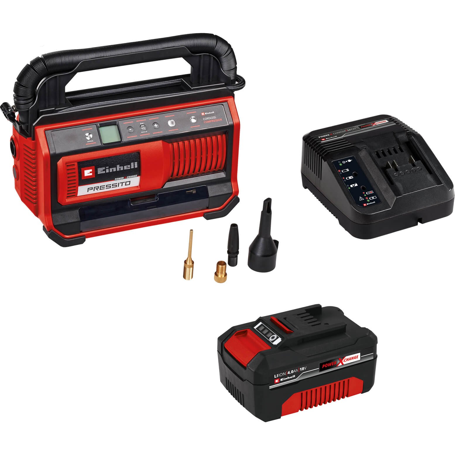 Einhell PRESSITO 18/25 18v Cordless or Mains Air Compressor and Inflator 1 x 4ah Li-ion Battery Charger