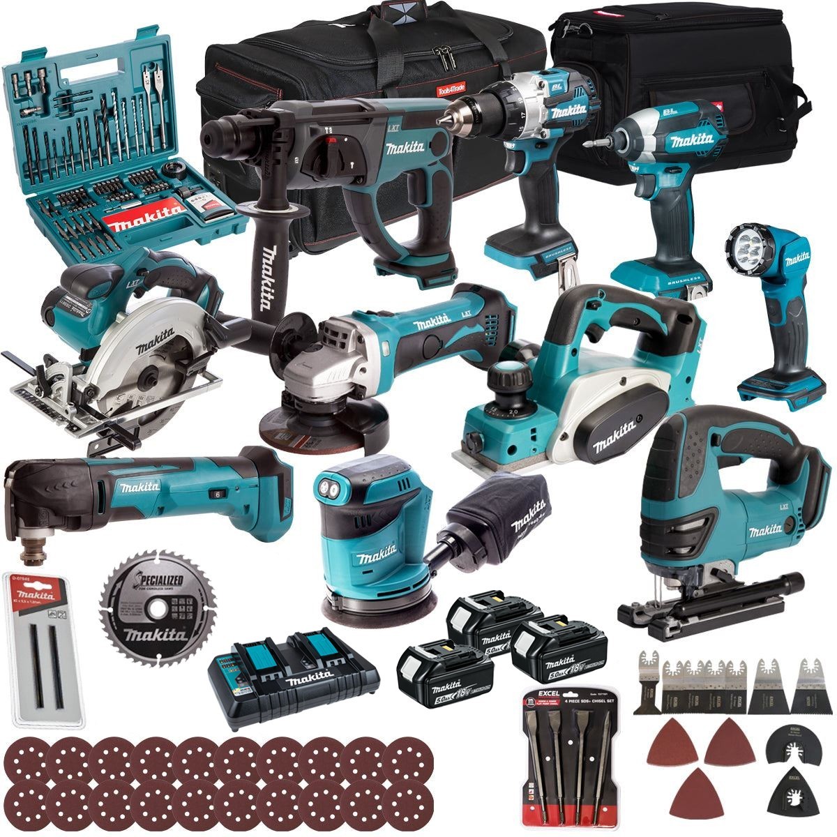 Makita 18V 7 Piece Power Tool Kit 3 x 5.0Ah Battery Charger & 100 Piece Bit Set