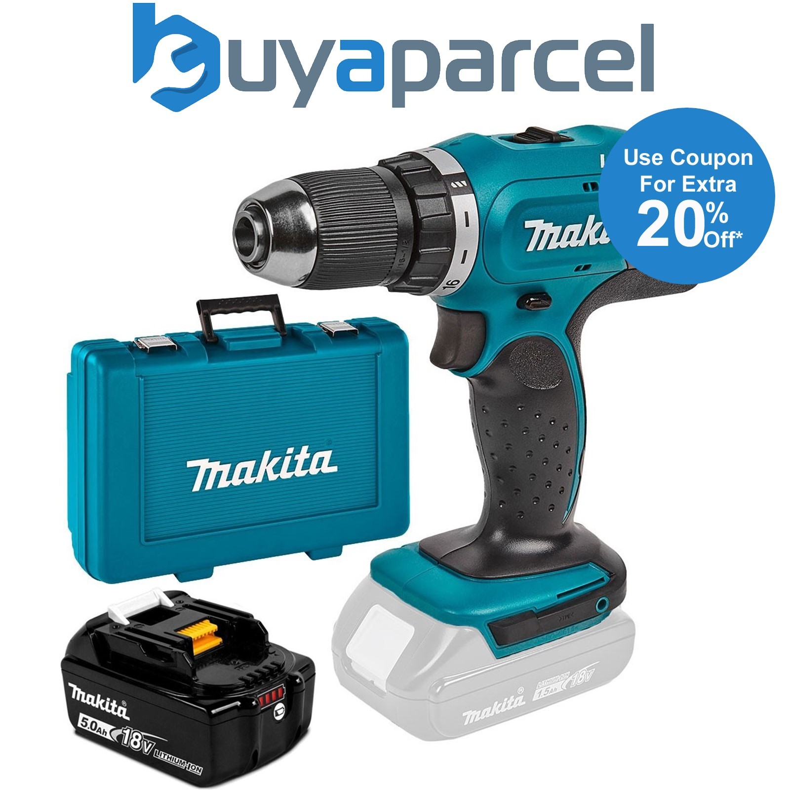 Makita DHP458Z 18v Combi Hammer Drill with 1 x 5.0Ah BL1850 Battery + DC18RC Charger & Case - Power Tool Combo Kit