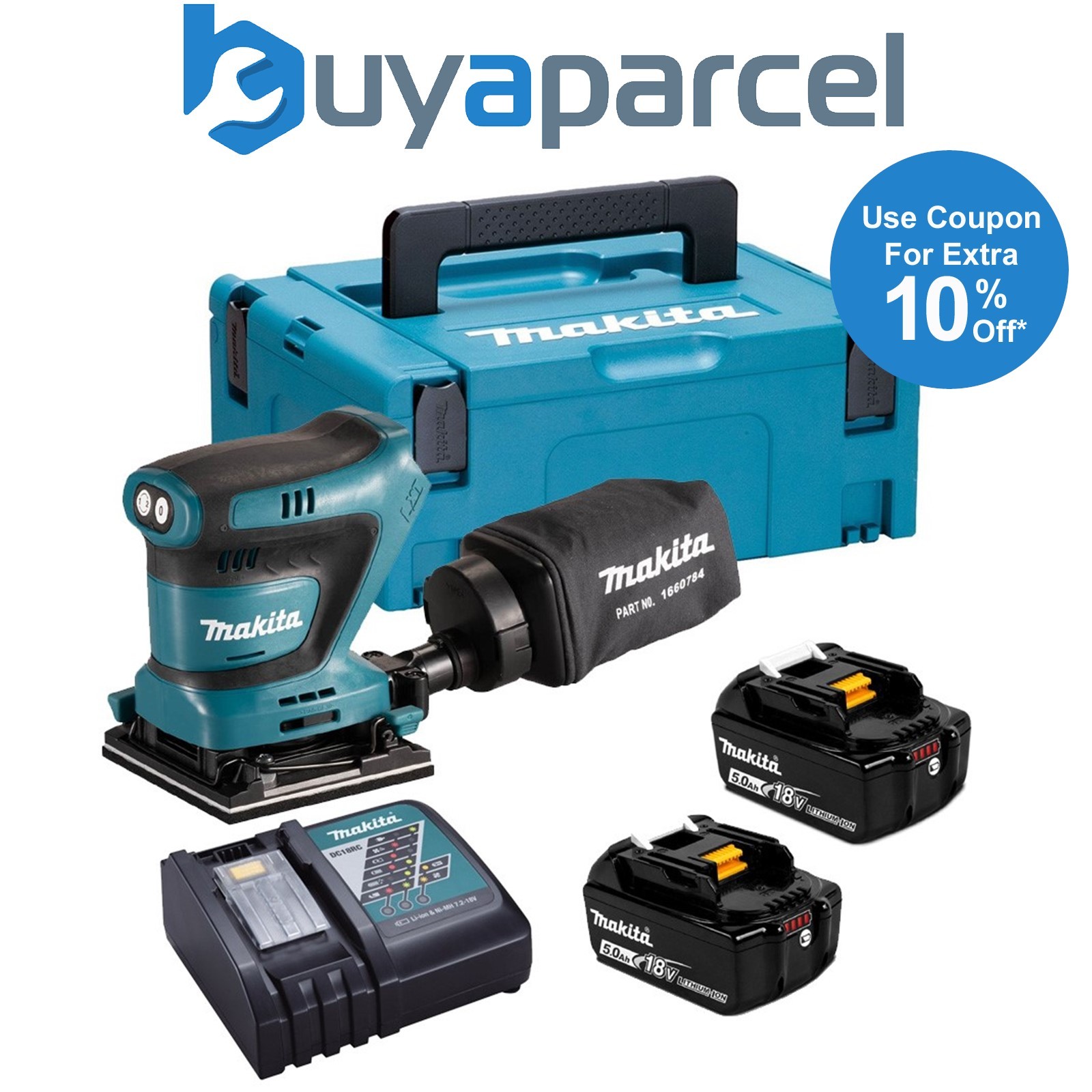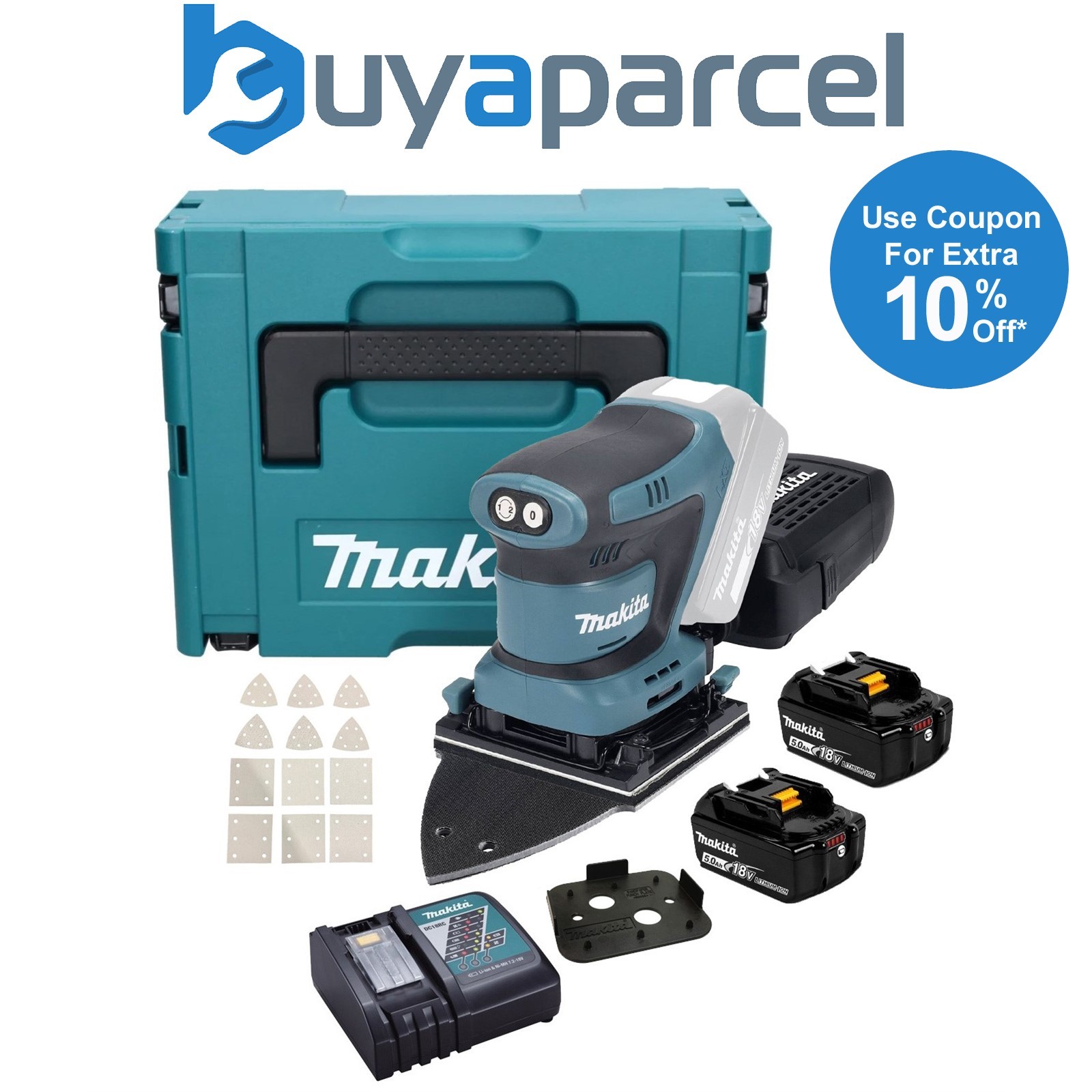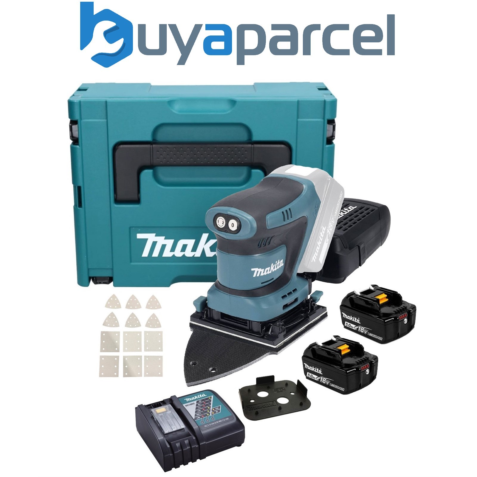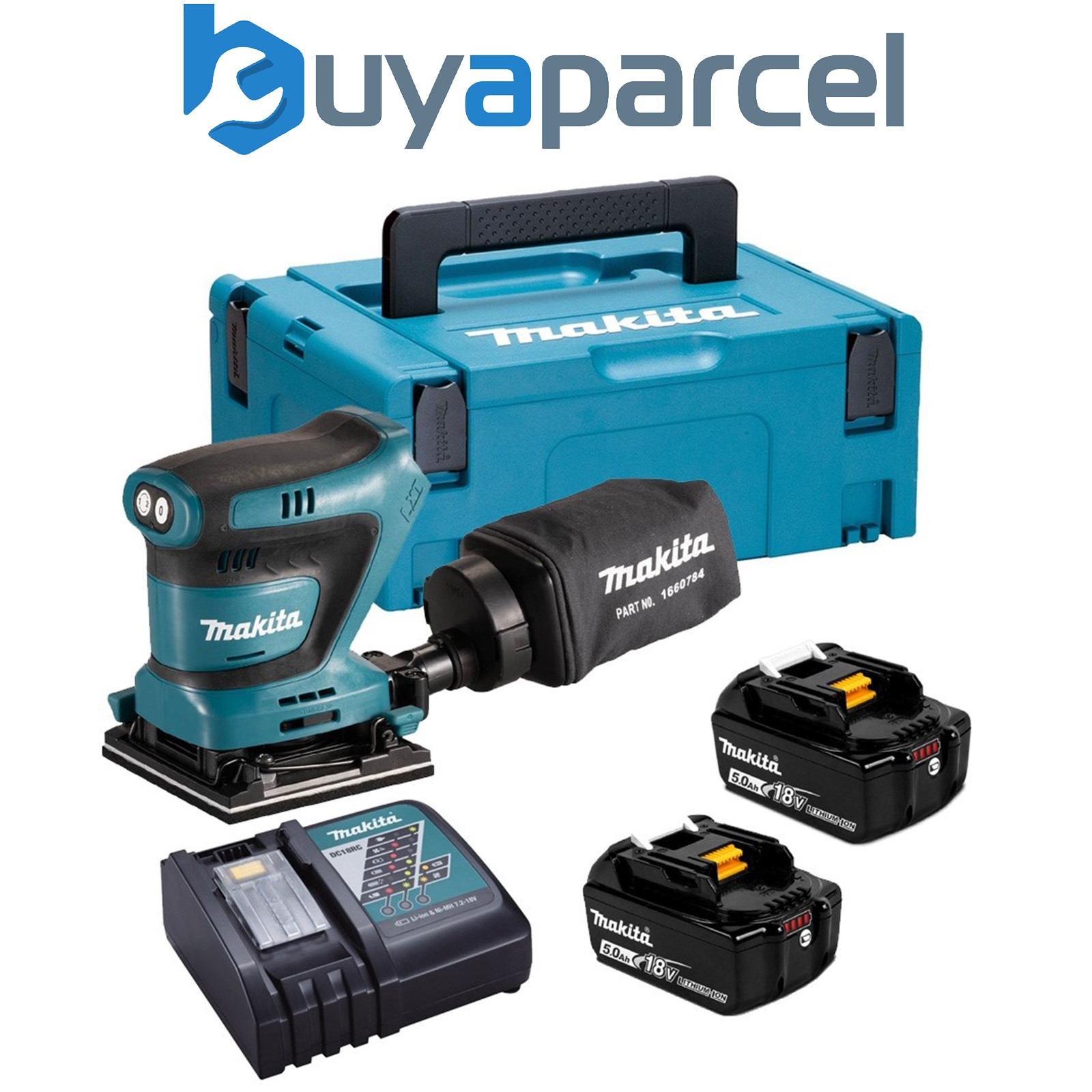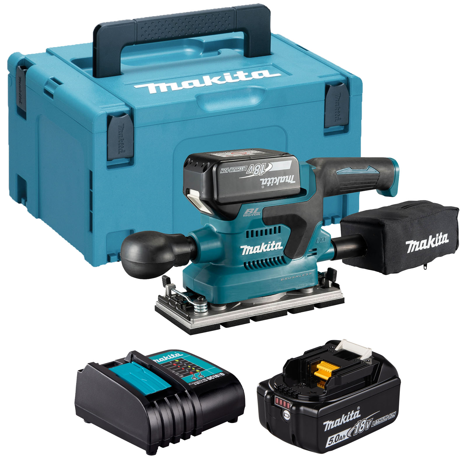 Makita DBO382 18v LXT Cordless Brushless Finishing Sander 2 x 5ah Li-ion Battery Charger Case