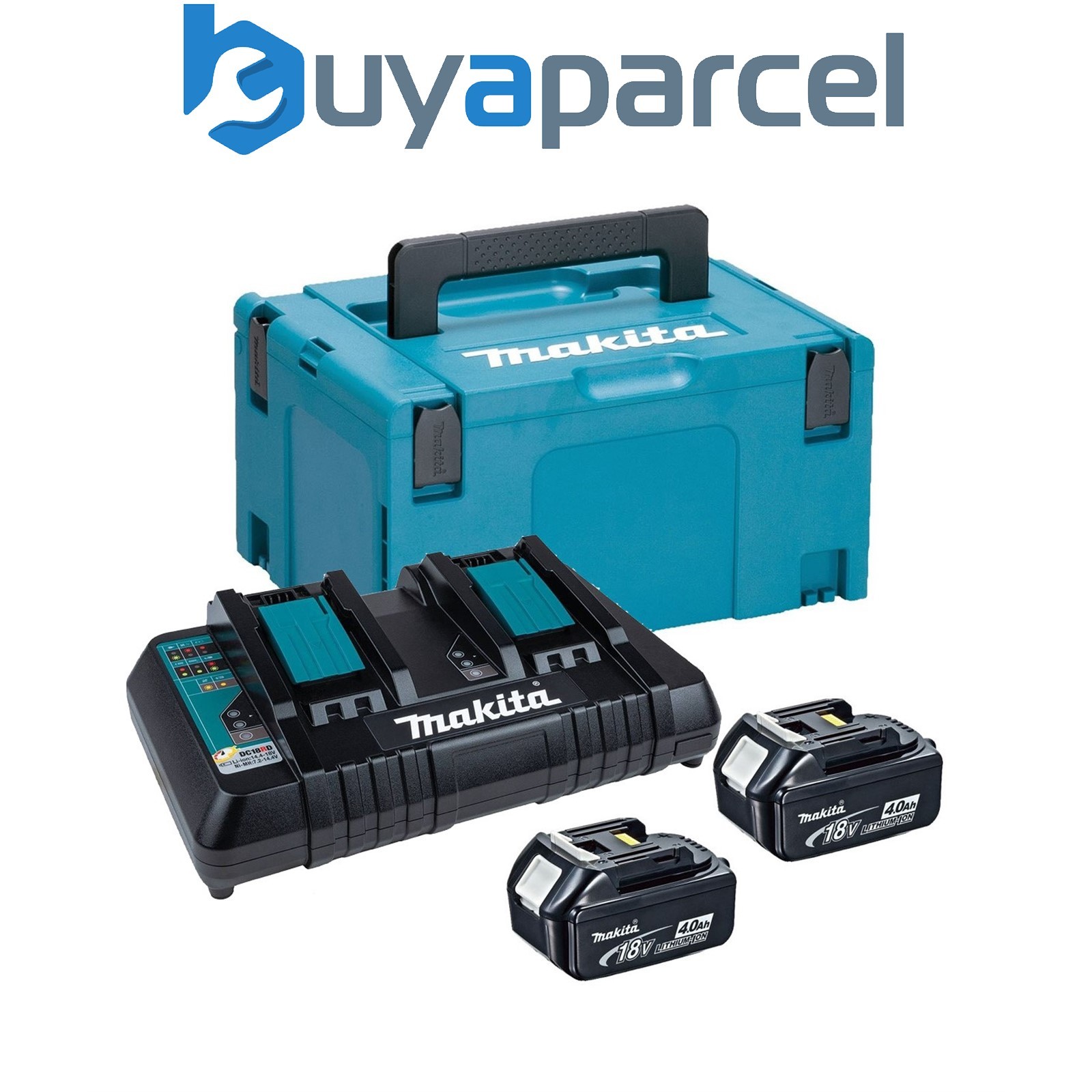 Makita BL1840 18v 2 x 4.0ah Lithium Batteries DC18RD Dual Port Charger + Makpac