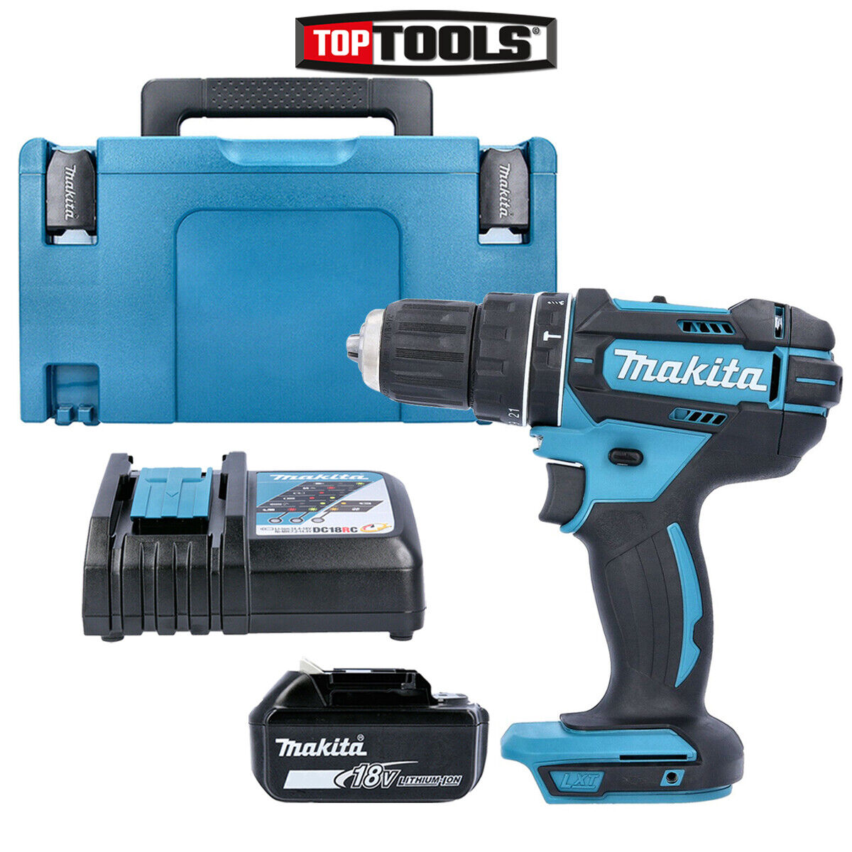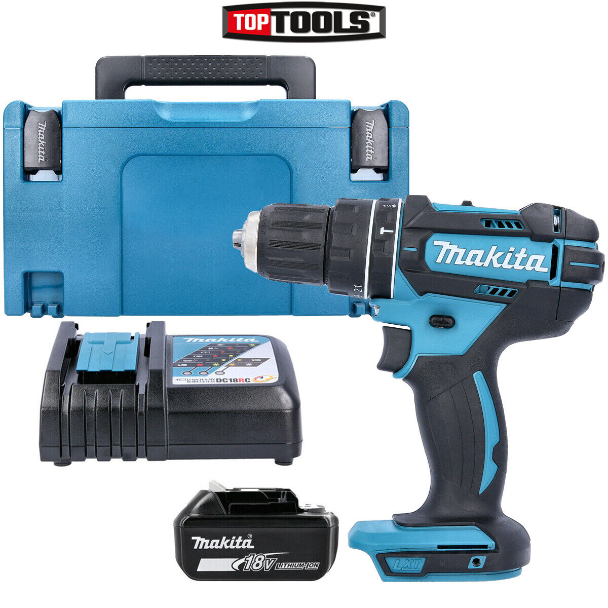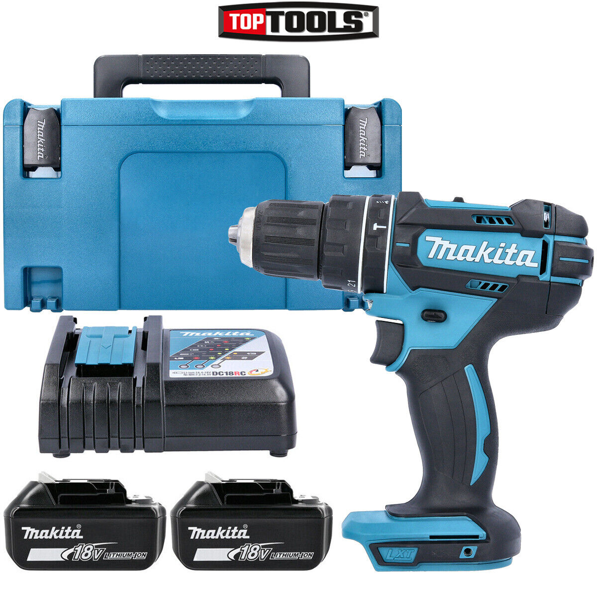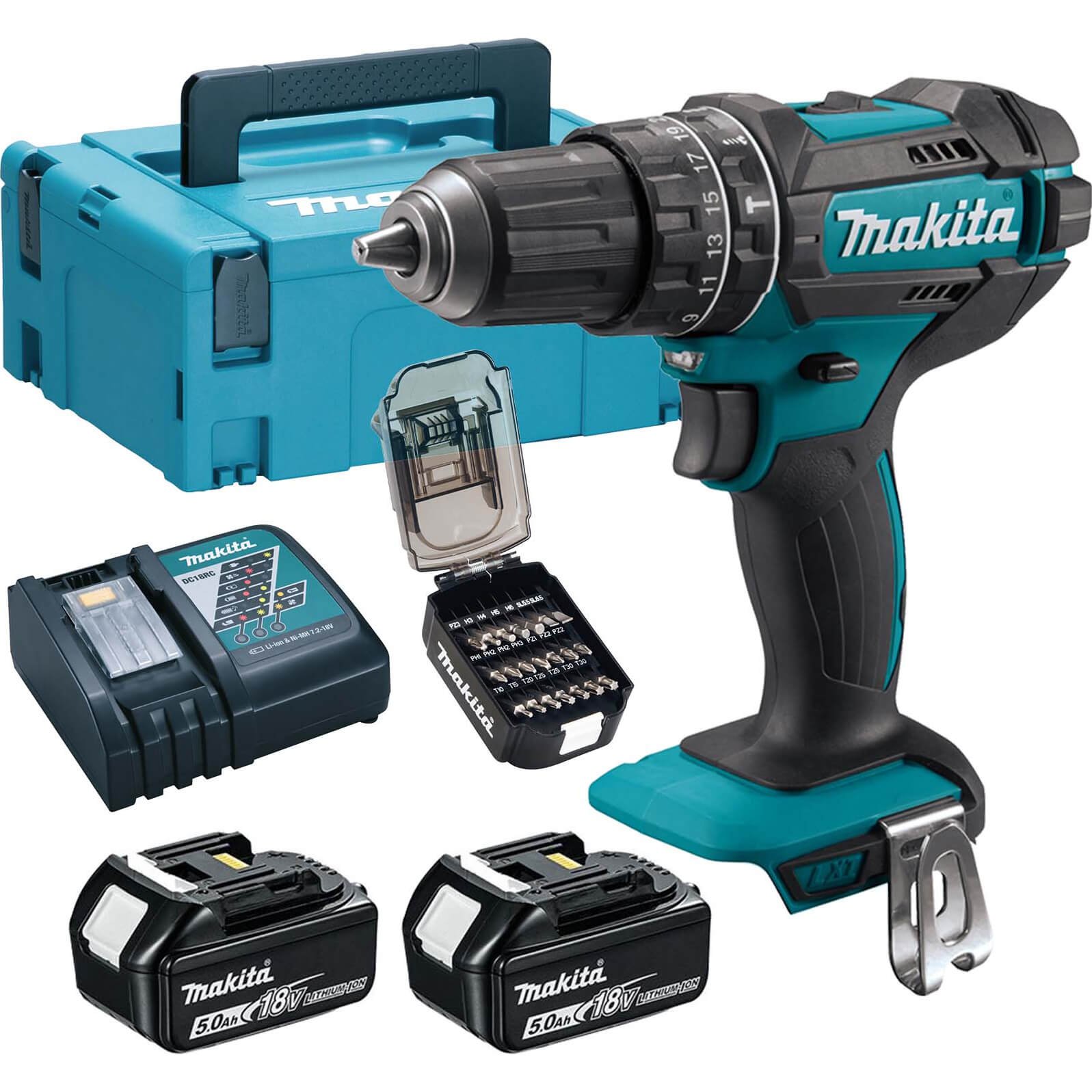 Makita DHP482 18v LXT Cordless Combi Drill 2 x 5ah Li-ion Battery Charger Case & 21 Accessories