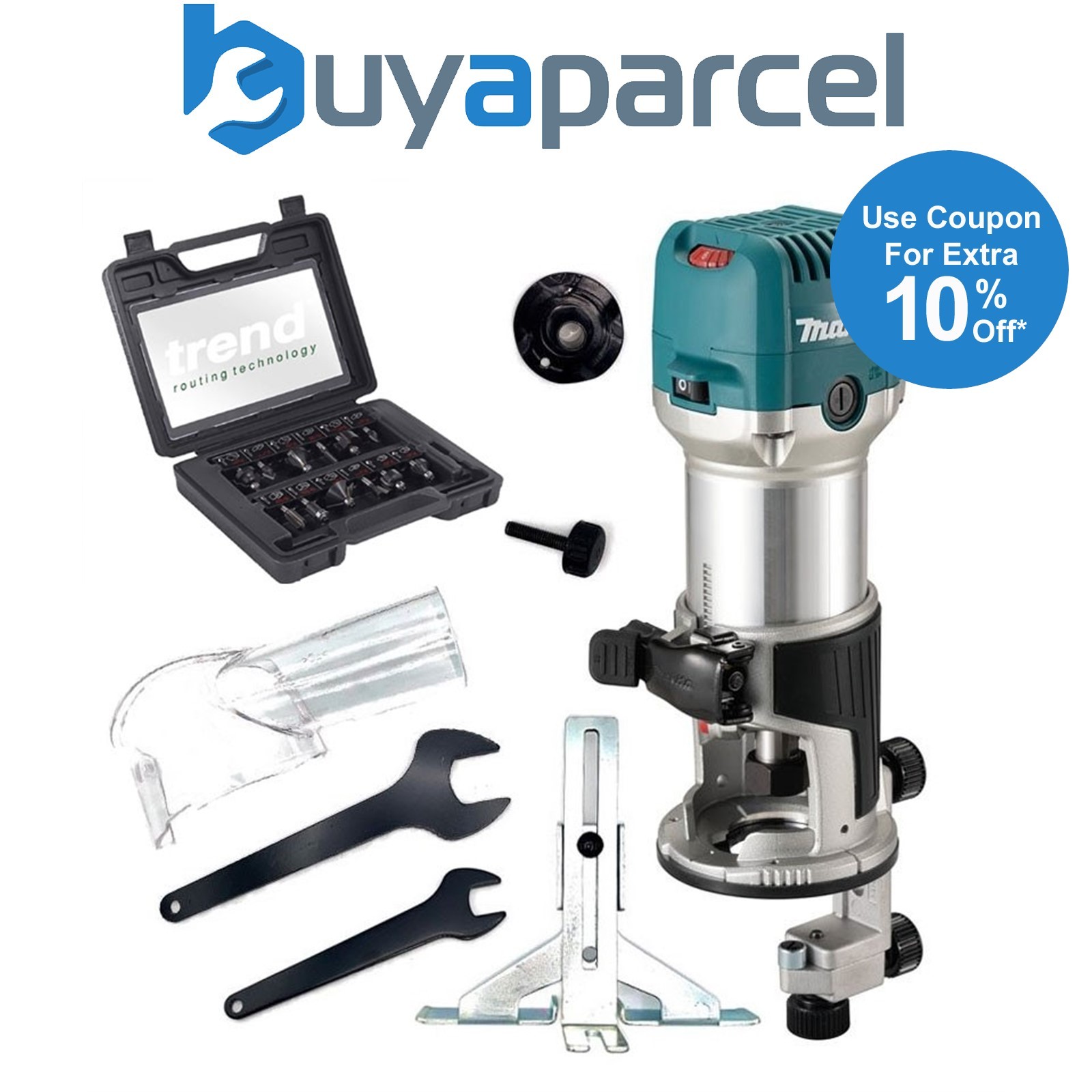 Makita RT0702CX4 1/4" Router Trimmer with Trimmer Guide 240V + 12PC Trend Set