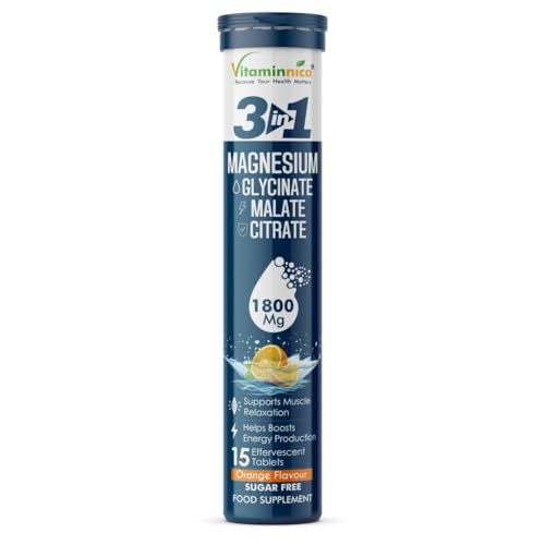 Vitaminnica Magnesium 3-in-1 Effervescent- 15 Tablets – High Absorption Magnesium Malate, Citrate & Glycinate – Energy, Muscle Function & Relaxation – Sugar-Free (Pack of 1, Orange)