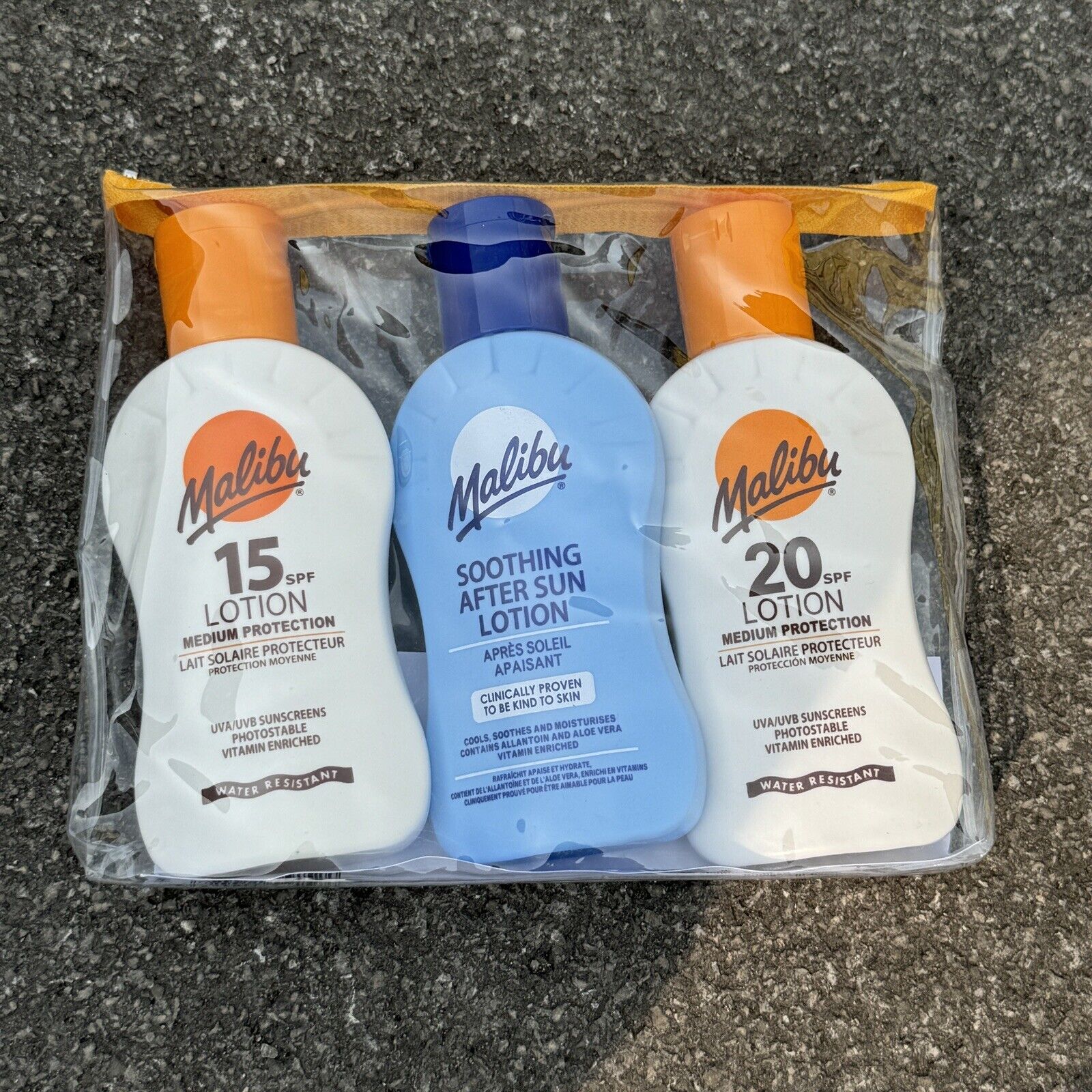 Malibu Sun Cream Lotion Travel Essentials 3 Pack SPF 15 & 20 Plus AfterSun 100ml