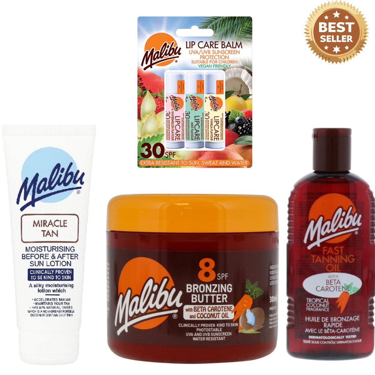 Malibu SPF8 bronzing butter 300ml, Miracle Tan 75ml, Tanning oil 100ml, lip balm