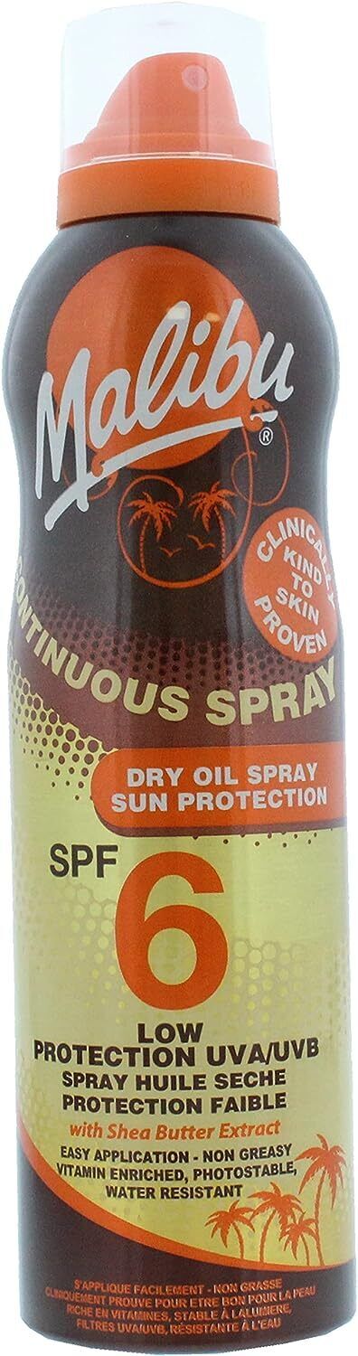 Malibu Sun SPF 6 Continuous Dry Oil Spray for Tanning with Shea Butter Extract,