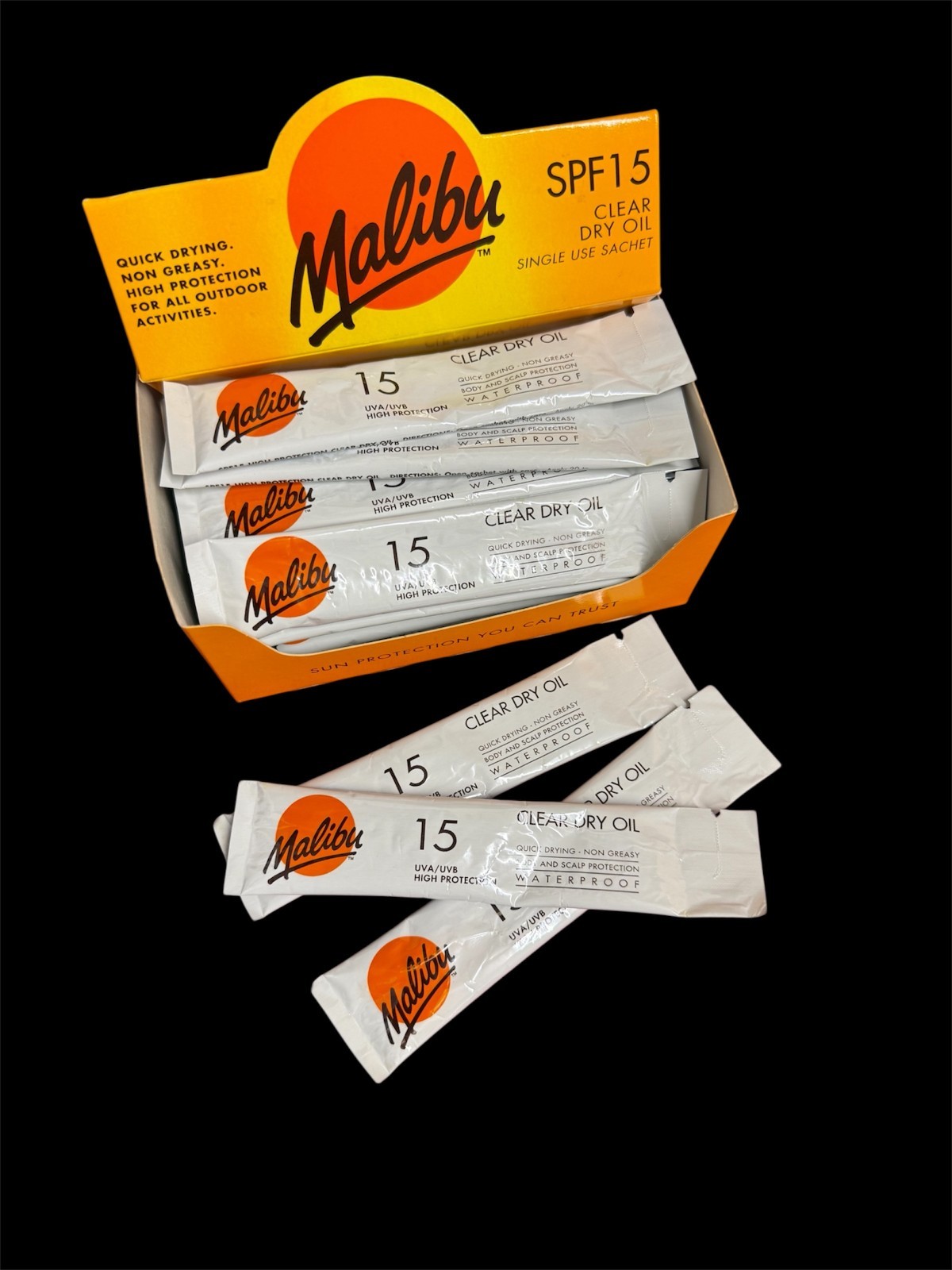 MALIBU SINGLE USE SACHET SPF15 - CLEAR DRY OIL - 24 PACK - BRAND NEW