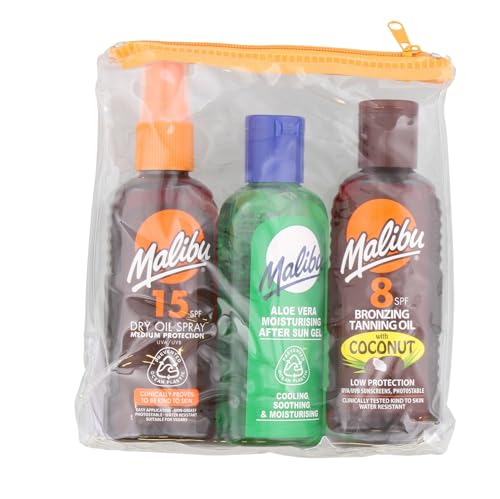 Malibu Sun Travel Essentials, Dry Oil Sprays and Soothing Aloe Vera Aftersun Gel, Medium Protection, Water Resistant, SPF 10 and 15, Multipack, 3 x 100ml