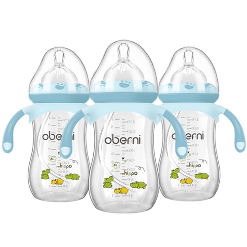 Oberni Weighted Baby Bottles with Size 4 Fast Flow Breast-Like Teat for 12 Months Plus / 1 Year Old Newborn Babies, 270ml/9oz, Non-Slip Handles, Anti-Colic, Blue/3Pack