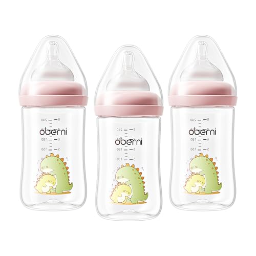 Oberni Anti-Colic Baby Bottles, 240ml / 8oz Newborn Bottle with Size 2" Medium Flow Breast Like Silicone Teat, 3M+ Breastfed and Milk Feeding, Pink/Pack of 3