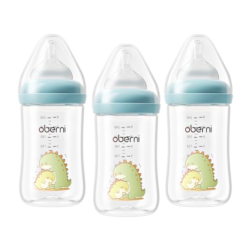 Oberni Anti-Colic Baby Bottles, 240ml / 8oz Newborn Bottle with Size 2" Medium Flow Breast Like Silicone Teat, 3M+ Breastfed and Milk Feeding, Blue/Pack of 3