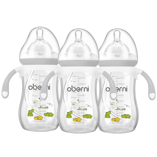 Oberni Weighted Baby Bottles with Size 4 Fast Flow Breast-Like Teat for 12 Months Plus / 1 Year Old Newborn Babies, 270ml/9oz, Non-Slip Handles, Anti-Colic, Grey/3 Pack