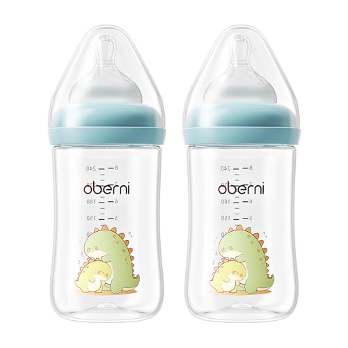 Oberni Anti-Colic Baby Bottles, 240ml / 8oz Newborn Bottle with Size 2" Medium Flow Breast Like Silicone Teat, 3M+ Breastfed and Milk Feeding, Blue/Pack of 2