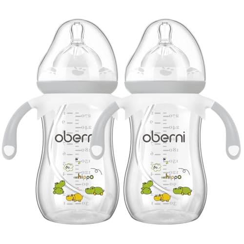 Oberni Weighted Baby Bottles with Size 4 Fast Flow Breast-Like Teat for 12 Months Plus / 1 Year Old Newborn Babies, 270ml/9oz, Non-Slip Handles, Anti-Colic, Grey/2 Pack