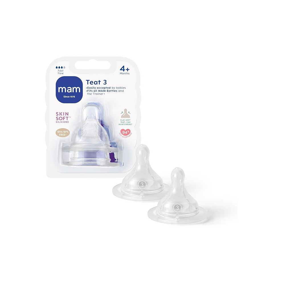 MAM Teats Size 3, Suitable for 4+ Months, MAM Fast Flow Teats with SkinSoft Silicone, Fits all MAM Baby Bottles, Baby Feeding Essentials, Pack of 2