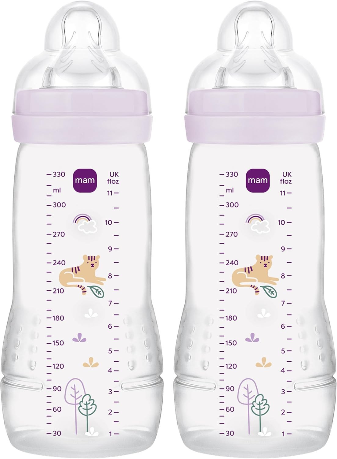 MAM Easy Active Bottles | 2 Pack (2 x 330ml) | Fast Flow MAM Teats Size 3 | Baby Accessories | Iris (Various Designs)