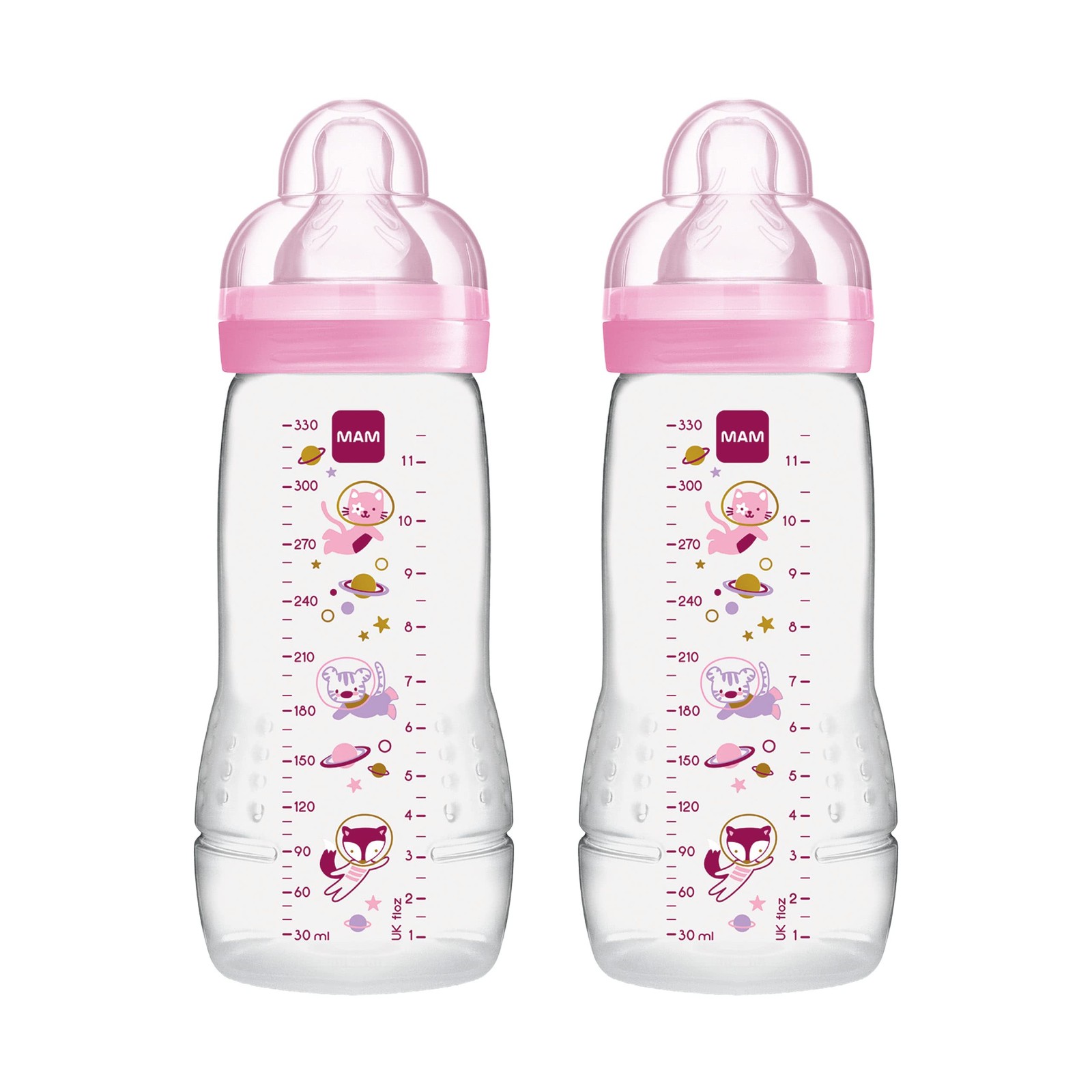 MAM Easy Active Bottles | 2 Pack (2 x 330ml) | Fast Flow MAM Teats Size 3 | Baby Accessories | Pink (Various Designs)