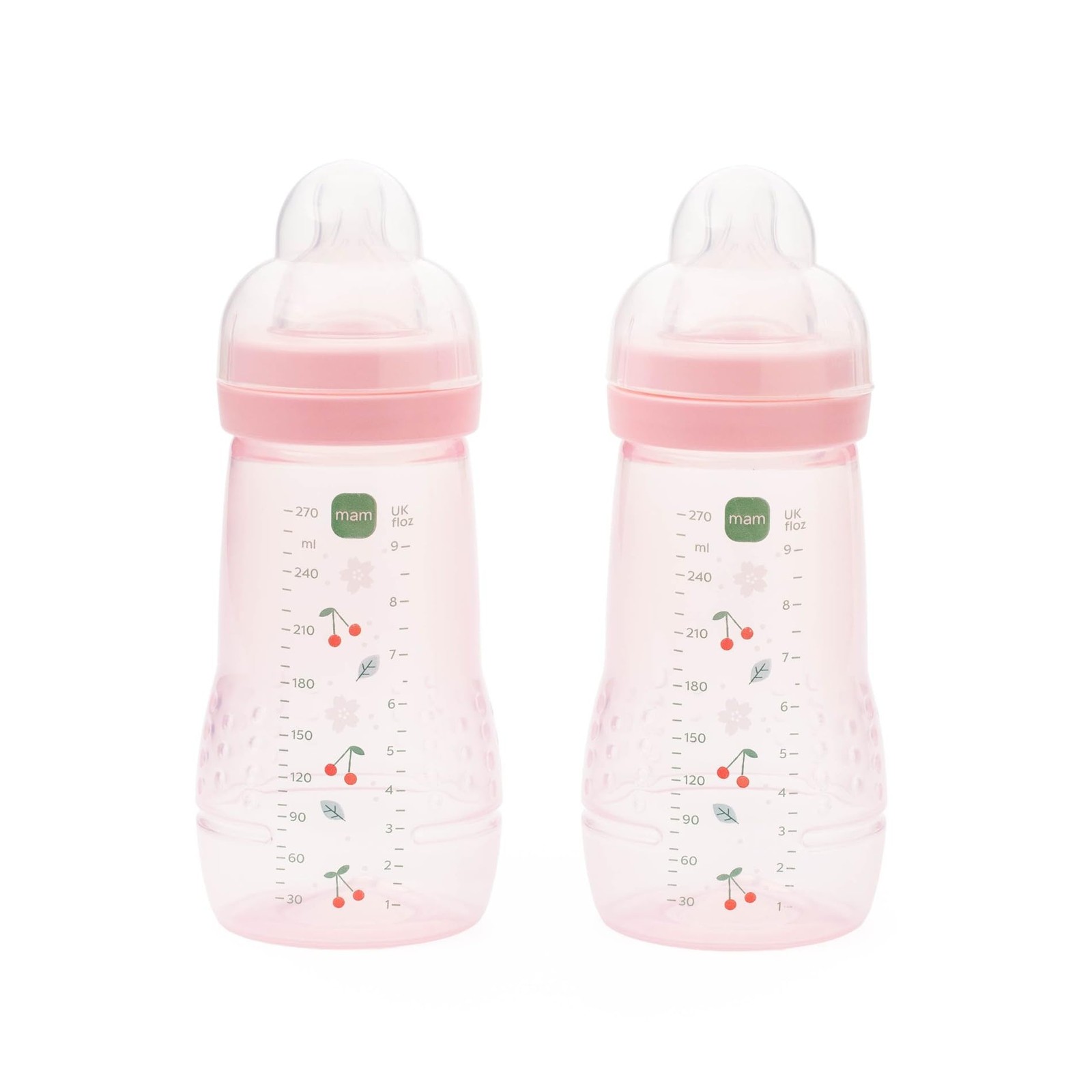 MAM Easy Active Bottles | 2 Pack (2 x 270ml) | Medium Flow MAM Teats Size 2 | Baby Accessories | Pink (Various Designs)