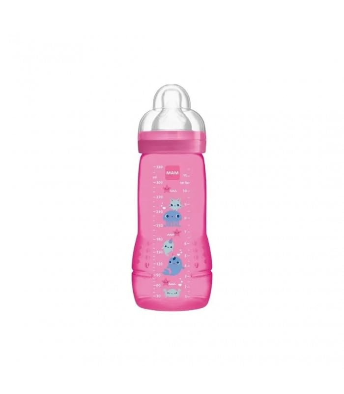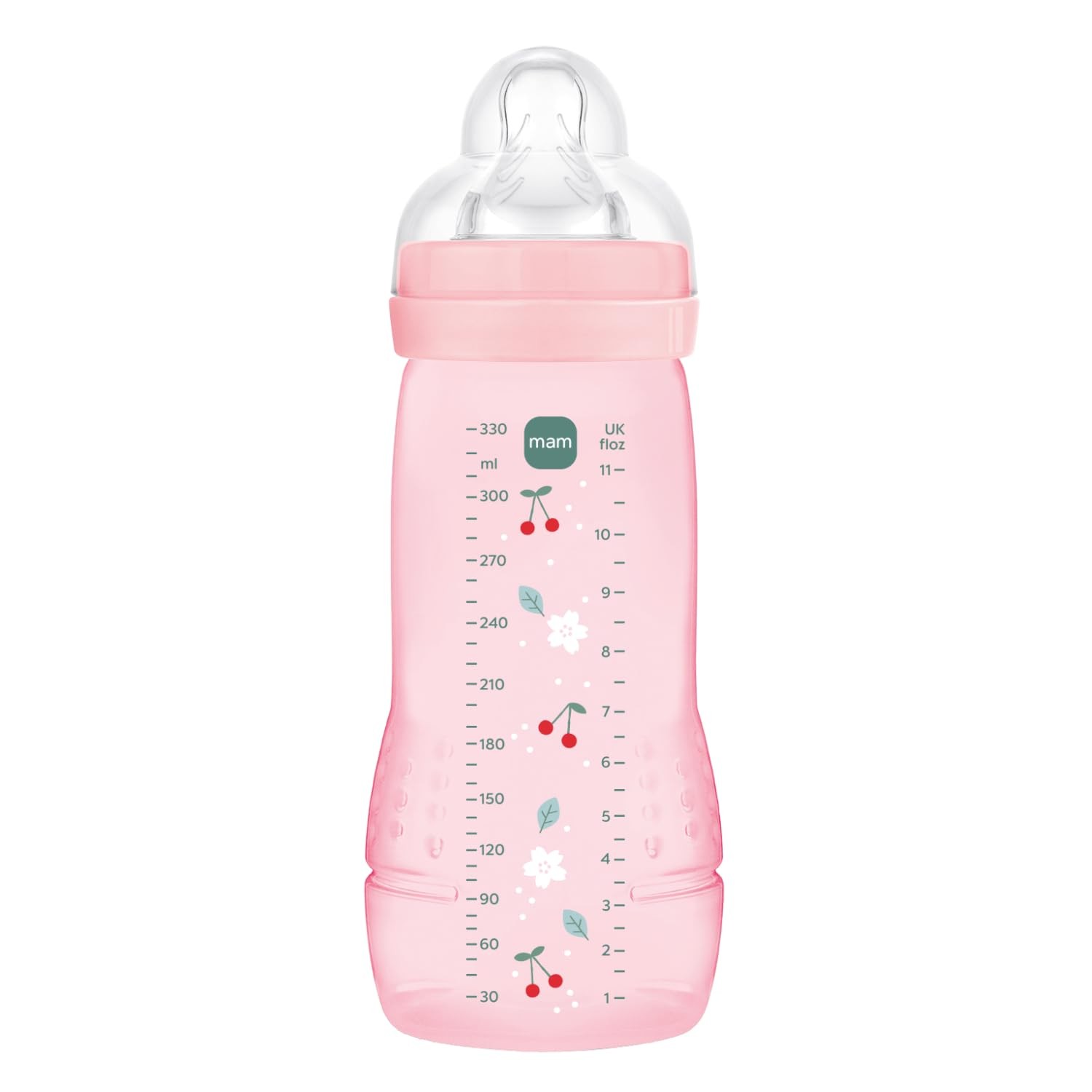 MAM Easy Active Bottles | 2 Pack (2 x 330ml) | Fast Flow MAM Teats Size 3 | Baby Accessories | Pink (Various Designs)