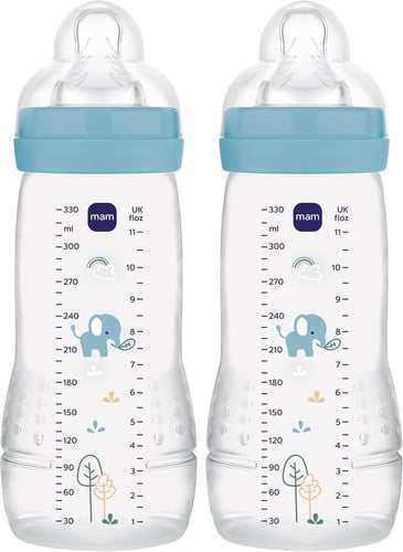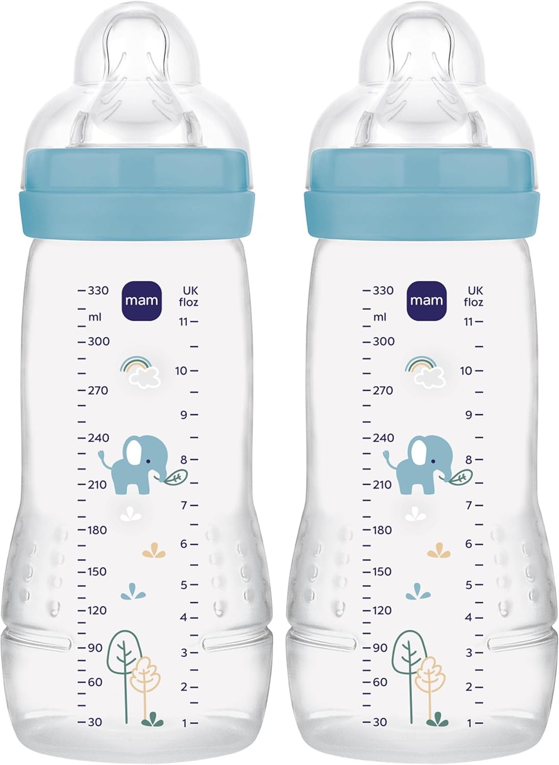 MAM Easy Active Baby Bottle with Fast Flow Teats Size 3, Twin Pack of Bottles, Feeding, 330 ml, Blue (Designs May Vary)