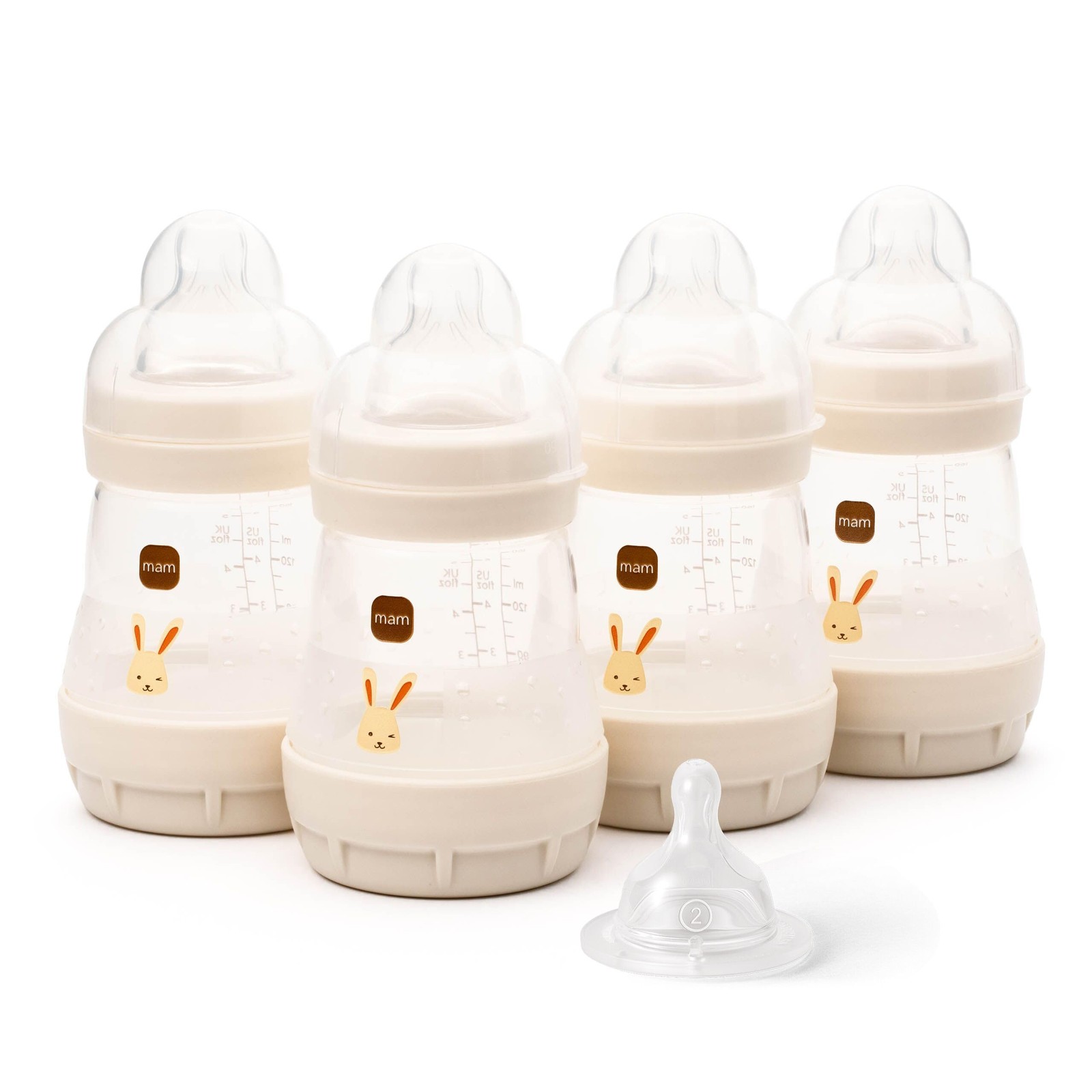 MAM Easy Start Anti-Colic Baby Bottles | 4 Pack (4X 160ml) | Self-Sterilising Baby Milk Bottle | Slow Flow MAM Teats Size 1 + 1x Medium Flow Teat Size 2 | Linen (Various Designs)