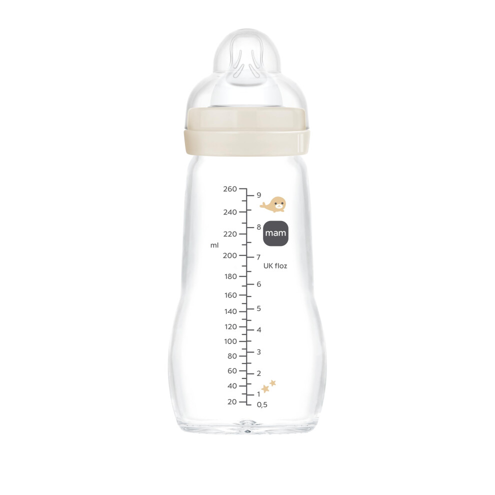 MAM Feel Good Glass Bottle | 1 Pack (1 x 260ml) | MAM Glass Bottle with Medium Flow Teat Size 2 | Baby Accessories for Newborn | White (Various