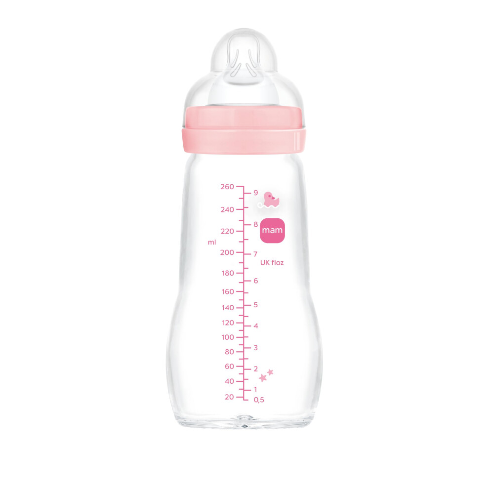 MAM Feel Good Glass Bottle Pack of 1 (1 X 260 Ml), MAM Bottle with Medium Flow MAM Teats Size 2, Newborn Essentials, MAM Baby Bottles 2+ Months, Pink