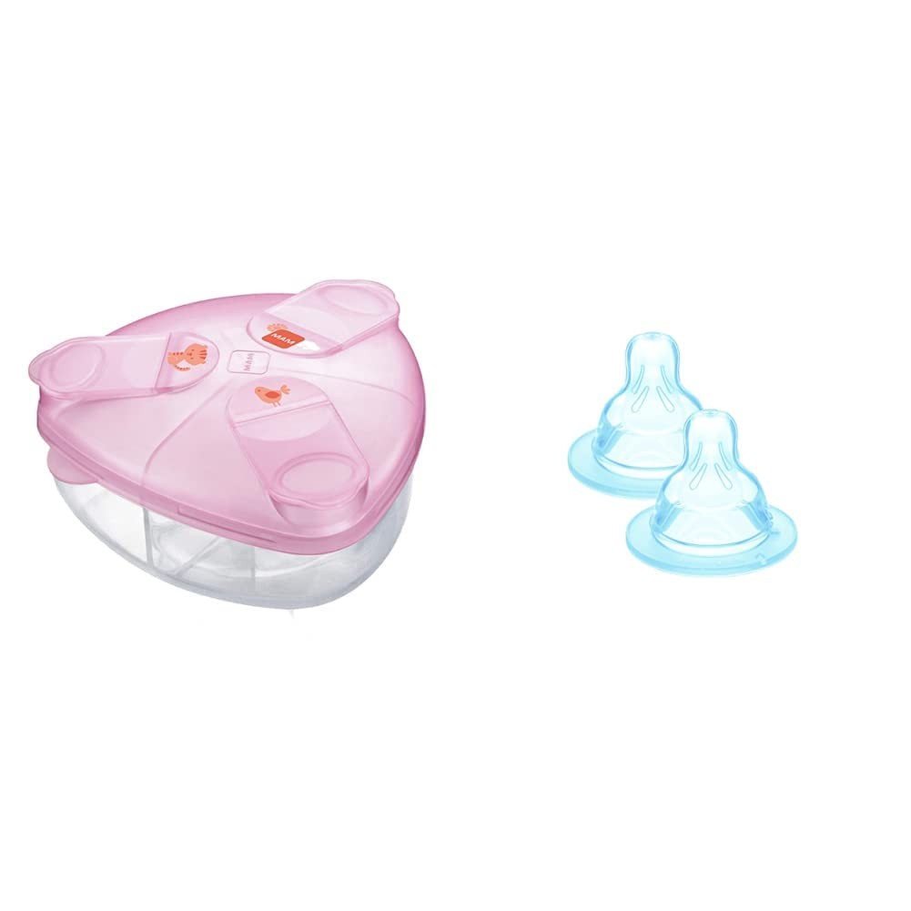 MAM Milk Powder Box, Formula Milk Powder Dispenser Stores 40 g Per Serving, Pink & Teats Size 2, Suitable for 2+ Months, Medium Flow Teats with SkinS
