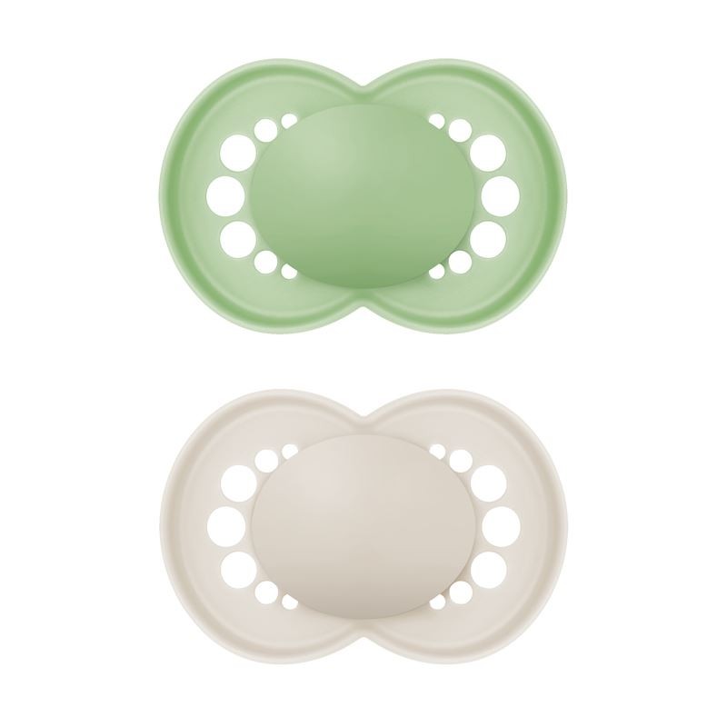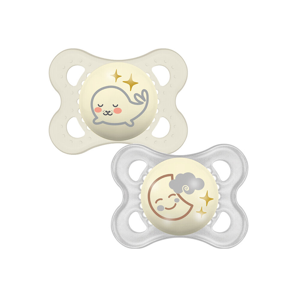 MAM Original Night Soother 2-6 Months (Pack of 2), Sustainable Baby Soother, SkinSoft Silicone Teat, Glow in the Dark Soother, Cream (Designs May