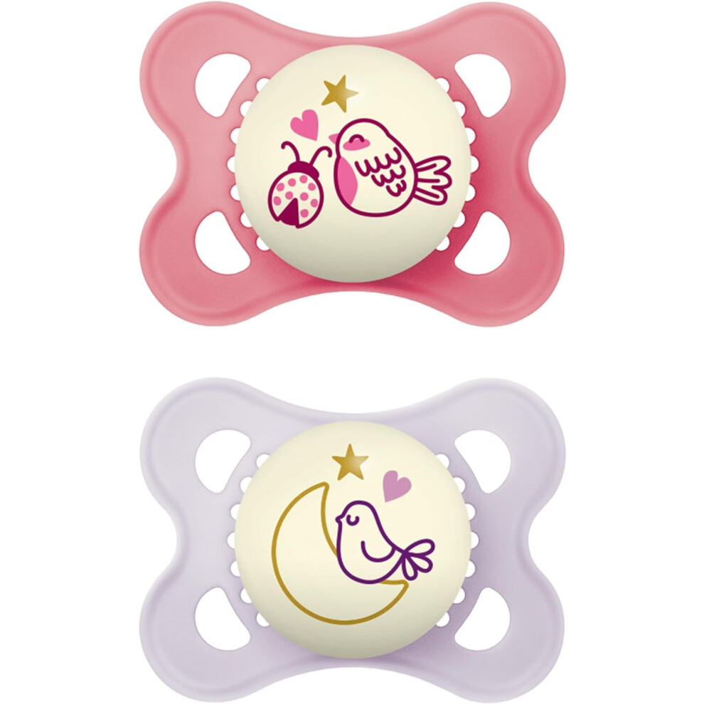 MAM Original Night Soother 2-6 Months (Pack of 2), Sustainable Baby Soother, SkinSoft Silicone Teat, Glow in the Dark Soother, Pink (Designs May Vary)