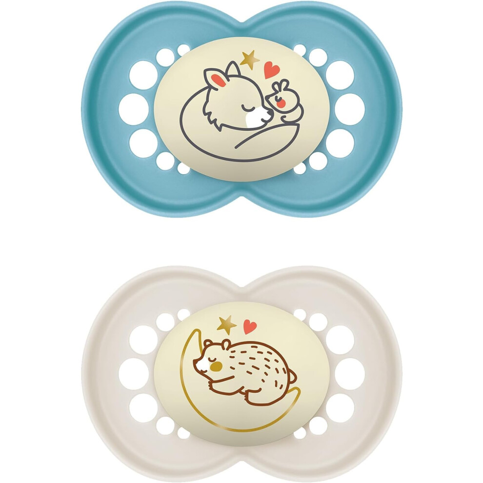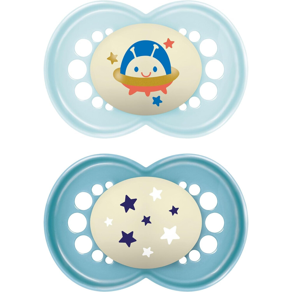 MAM Original Night Soother 6+ Months (Set of 2), Sustainable Baby Soother, SkinSoft Silicone Teat, Glow in the Dark Soother, Blue (Designs May Vary)