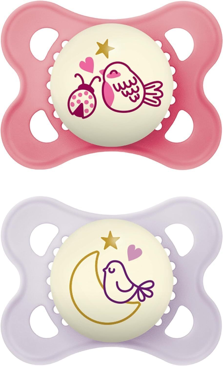 MAM Original Night Soother 6+ Months (Pack of 2), Sustainable Baby Soother, SkinSoft Silicone Teat, Glow in the Dark Pink (Designs May Vary)