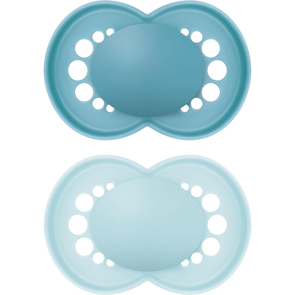 MAM Original Soother 6+ Months (Pack of 2), Baby Soother Made from Sustainable Material, SkinSoft Silicone Teat, with MAM Soother Case, Blue (Designs