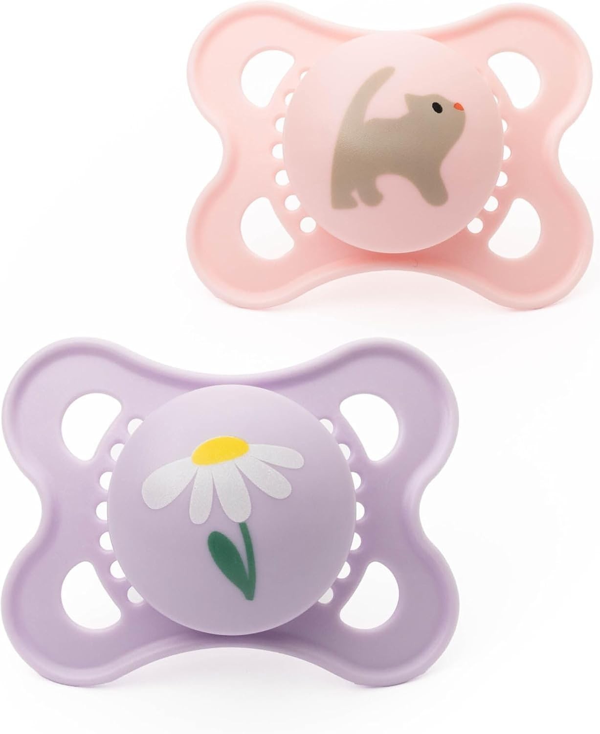 MAM Original Soothers | 0-6 Months | 2 Pack | Comes in Dummy Steriliser Case | Sustainable Materials | Baby Accessories for Newborn | Pink/Purple (Various Designs)