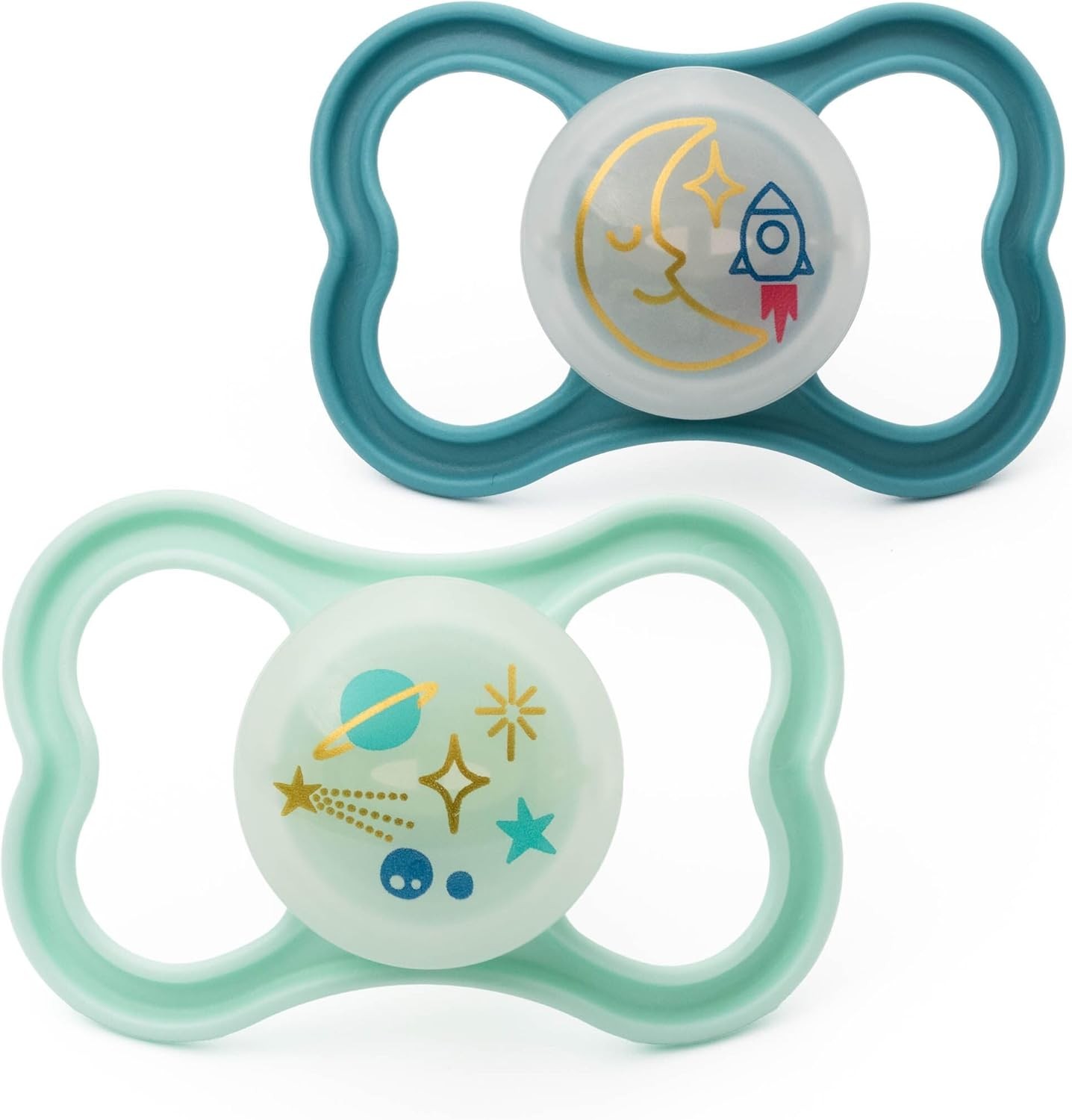 MAM Air Night Soothers | 6-18 Months | 2 Pack | Glow in The Dark Dummies | Comes in Dummy Steriliser Case | Baby Accessories | Blue (Various Designs)