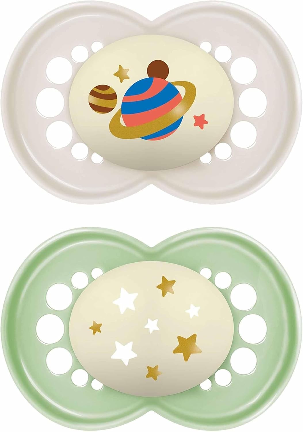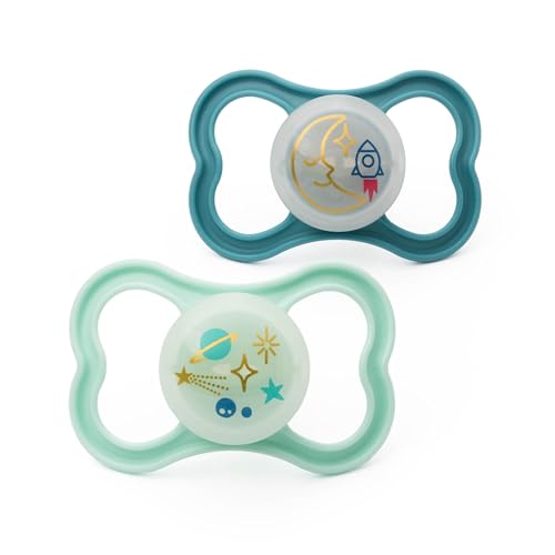 MAM Perfect Night Soothers | 6+ Months | 2 Pack | Glow in the Dark Dummies | Comes in Dummy Steriliser Case | Baby Accessories for Newborn | White/Gr