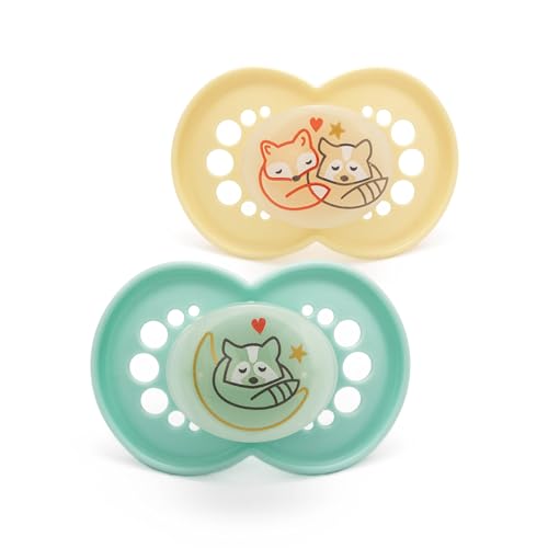 MAM Original Night Soothers | 6 Plus Months | 2 Pack | Glow in The Dark Dummies | Comes in Dummy Steriliser Case | Baby Accessories | Green/White (Various Designs)