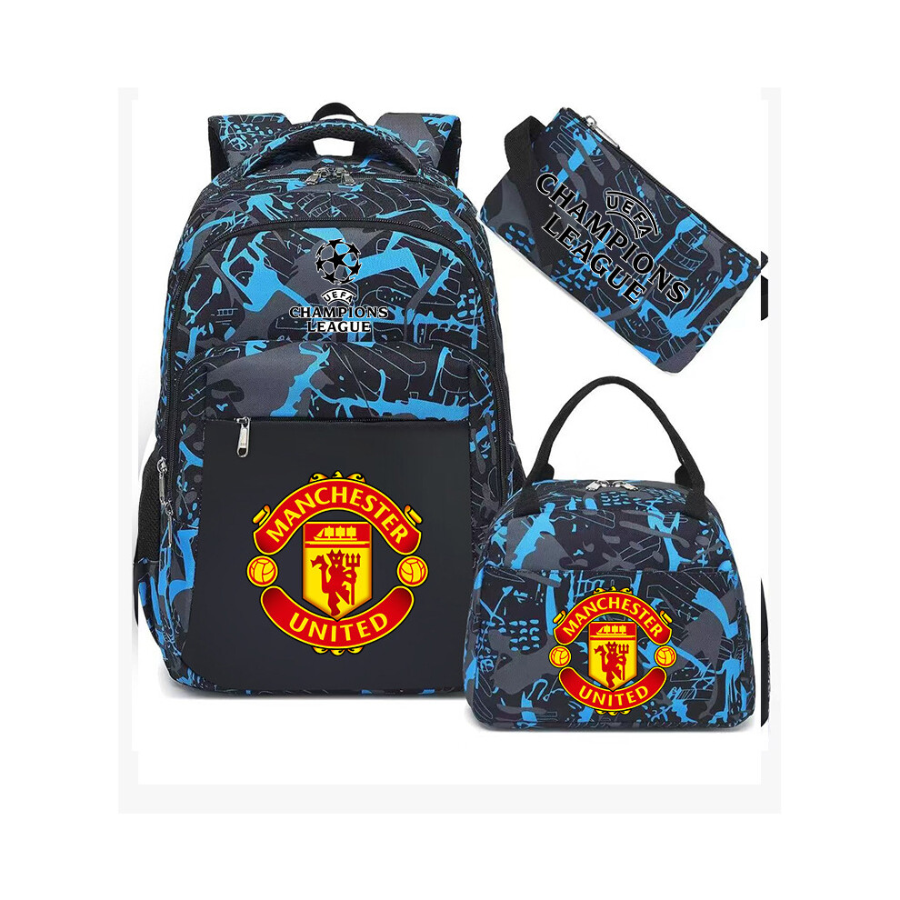 (Blue Manchester United) Football star peripheral backpack student schoolbag three-piece lunch bag pencil bag children men's style