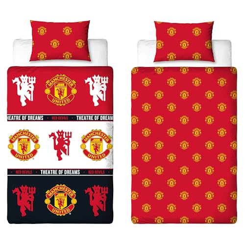 MANCHESTER UNITED FC Official Single Duvet Cover Set, Patch Design, Red Reversible 2 Sided Football Bedding Cover Official Merchandise Including Matching Pillow Case