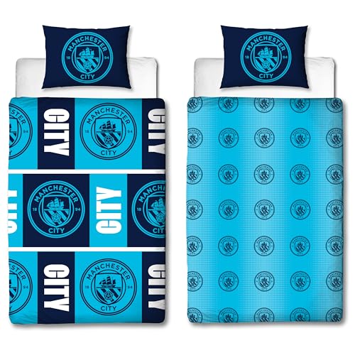 Manchester City FC Official Single Duvet Cover Set | Flashy Design | Blue Reversible 2 Sided Football Bedding Cover Official Merchandise Including Matching Pillow Cases | Polycotton