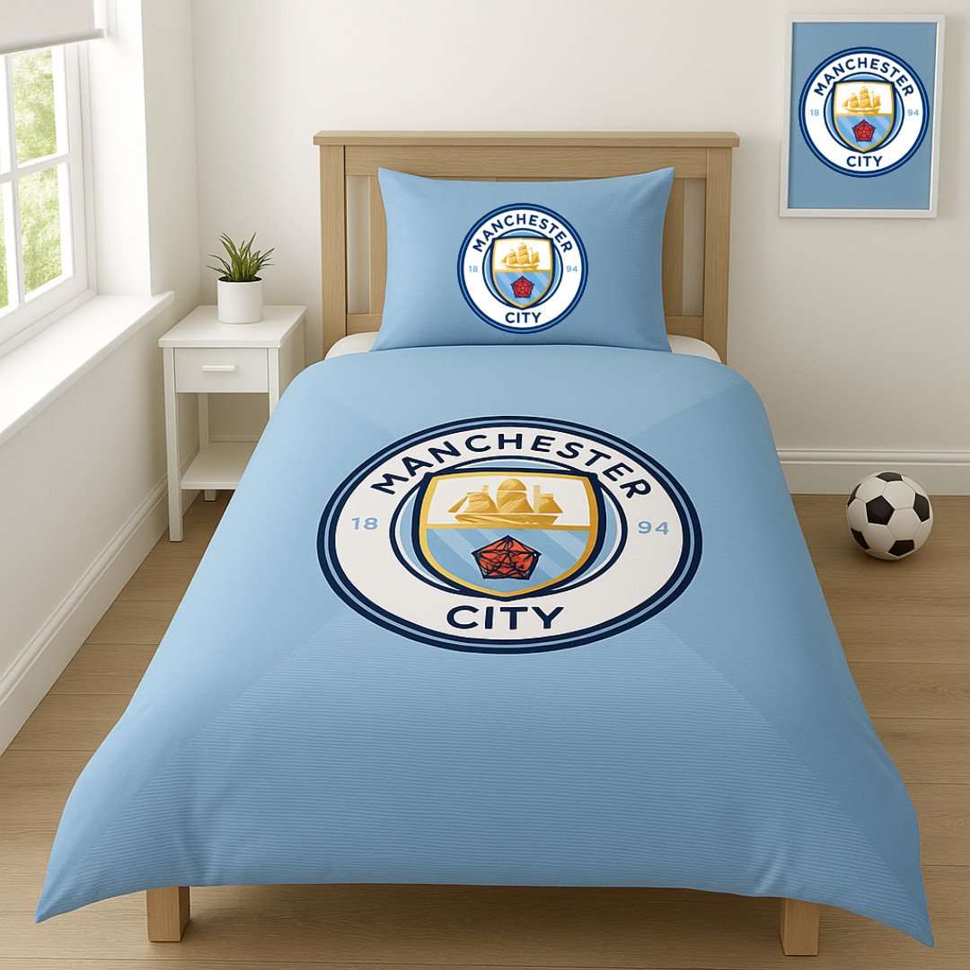 Manchester City FC Single Duvet Cover & Pillowcase Set Crest Football Bedding