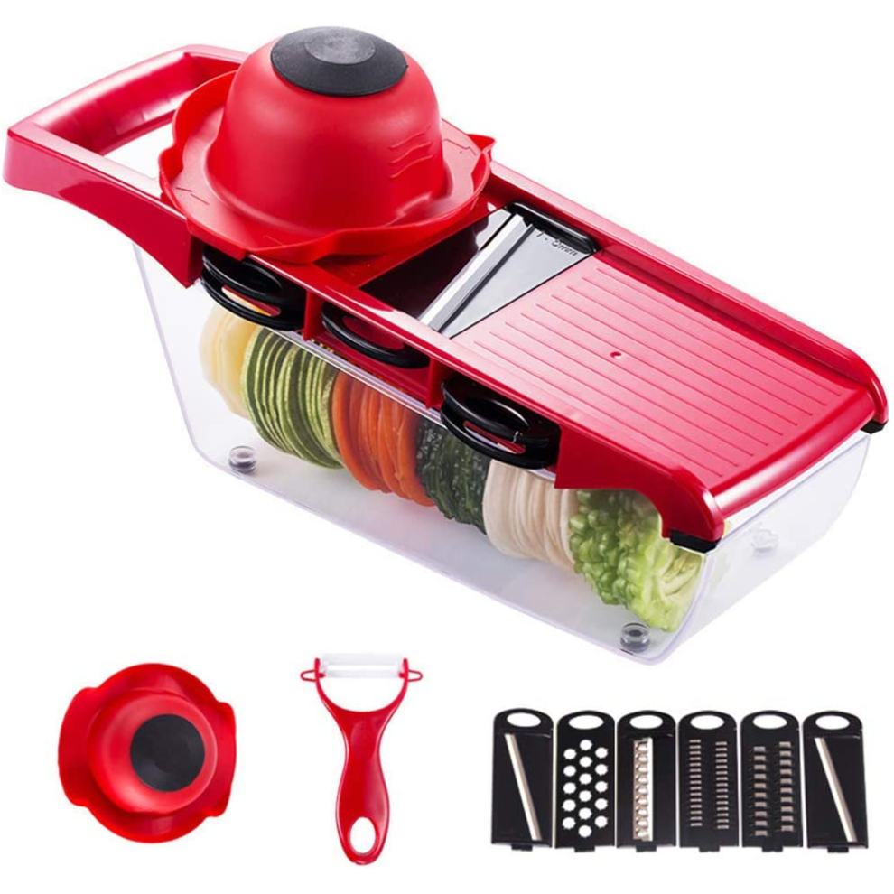 Mandoline Slicer All in 1, Kitchen Mandolin Vegetable Cutter Grater with Multifunction Interchangeable Stainless Steel Blades and Food Container for
