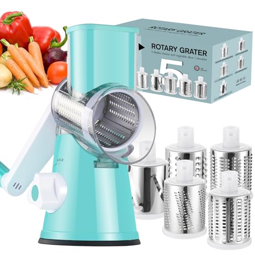 Ourokhome Rotary Cheese Grater Hand Crank, Kitchen Shredder Speed Mandolin Slicer Ice Shaver with Handle and Drum Blades for Cheese, Vegetable, Nuts, Chocolate, Potato, Carrot, 5 Blades, Blue