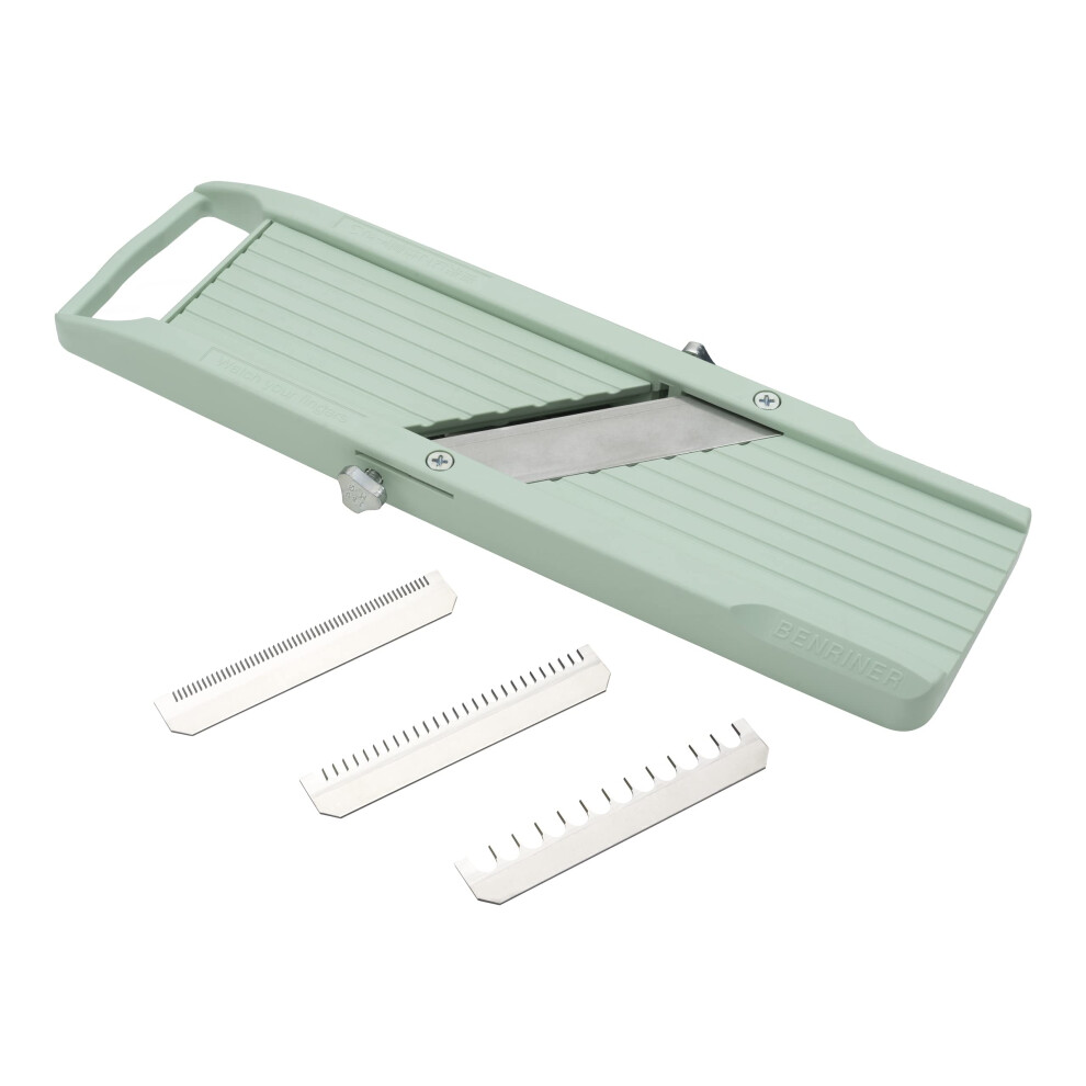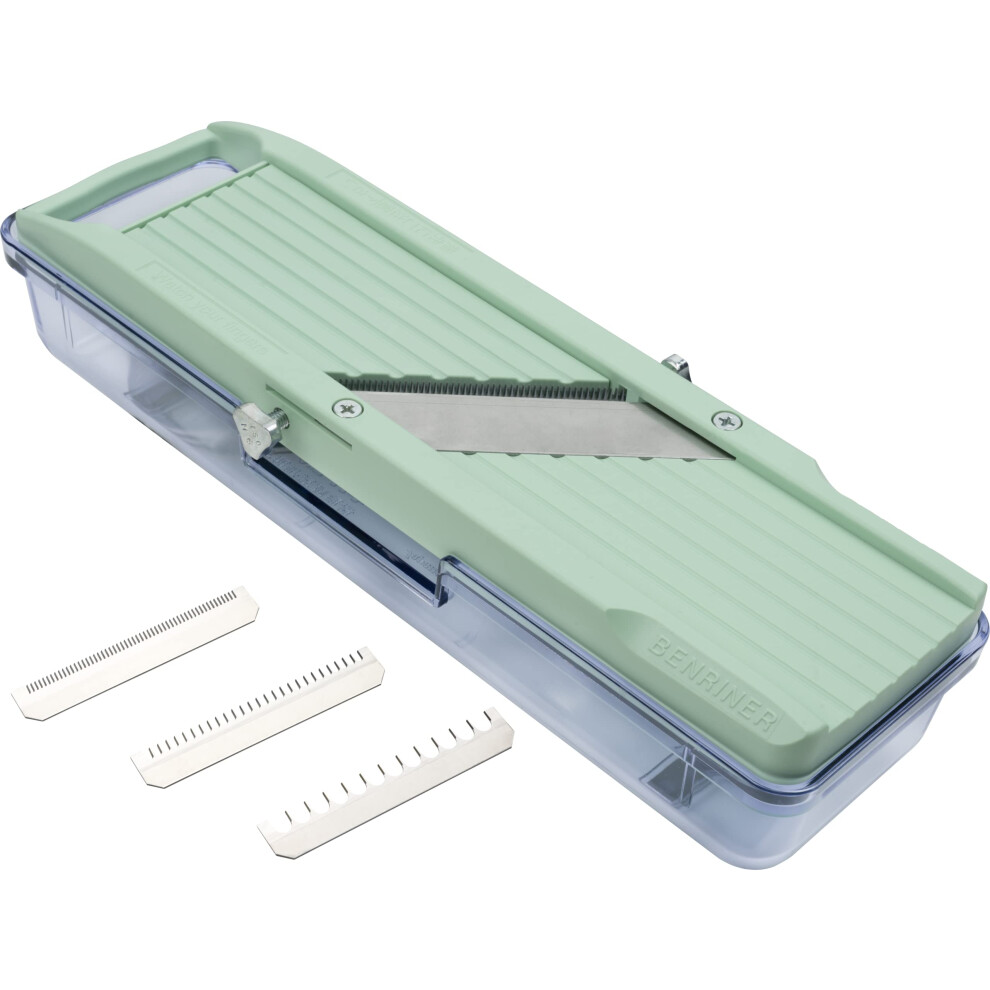 Benriner BN-3GR Japanese Handheld Mandolin Slicer with Three Interchangeable Stainless-Steel Blades-Ivory, Vegetable Fruit Cutter Peeler, Stainless Steel, Green, Catch Tray