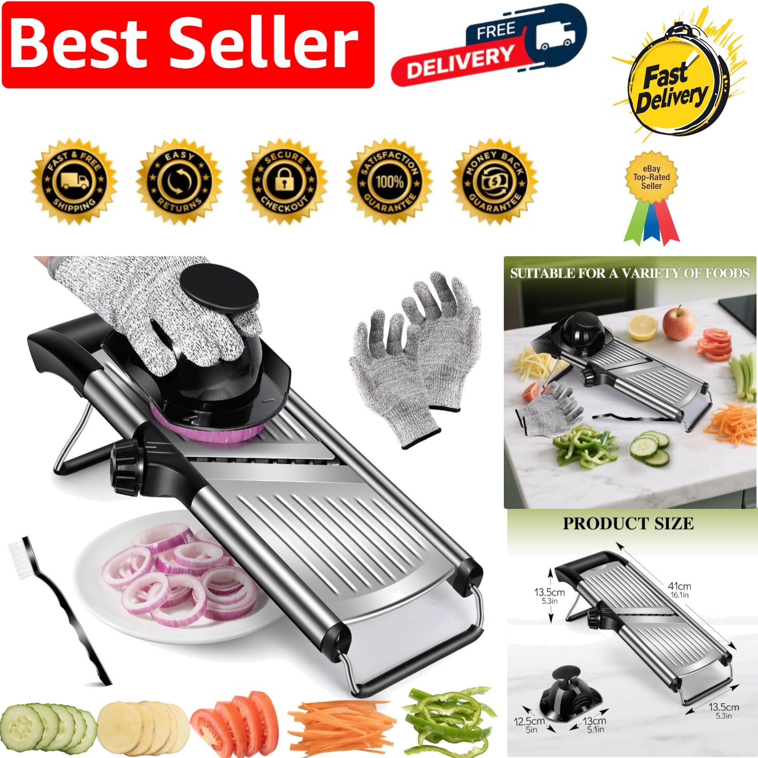 Mandoline Vegetable Slicer, 7 in 1 Stainless Steel Vegetable Cutter, Adjustable Mandoline Food Slicer for Potato, Onion, Cucumber, Cabbage, Included Gloves, Food Pusher and Cleaning Brush