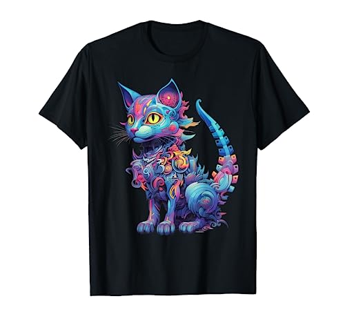 Psychedelic Manga Cat In Colorful Fantasy Animal Art Mandala T-Shirt